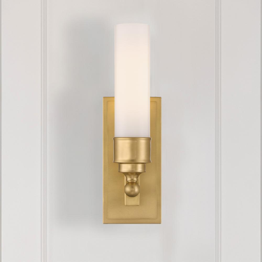 The Wilcox collection includes a white cylindrical glass shade and a rectangular back plate with stepped detailing. It is damp-listed for safe use in moisture-prone areas. The collection offers a single light option, suitable for mounting on either side of a mirror, and a double light option, perfect for placing over a vanity. This elegant fixture adds a sophisticated touch to bathroom spaces.