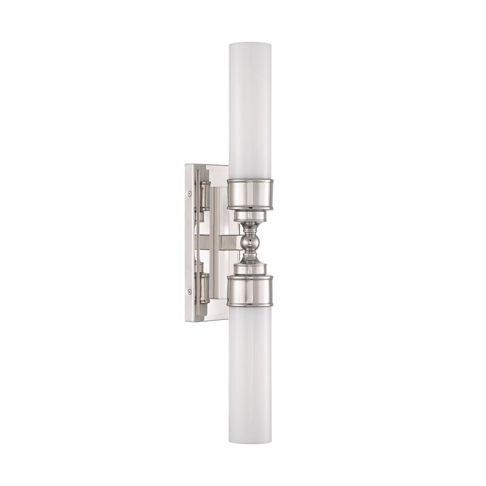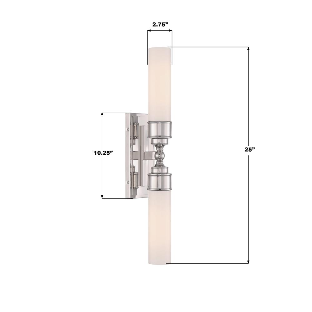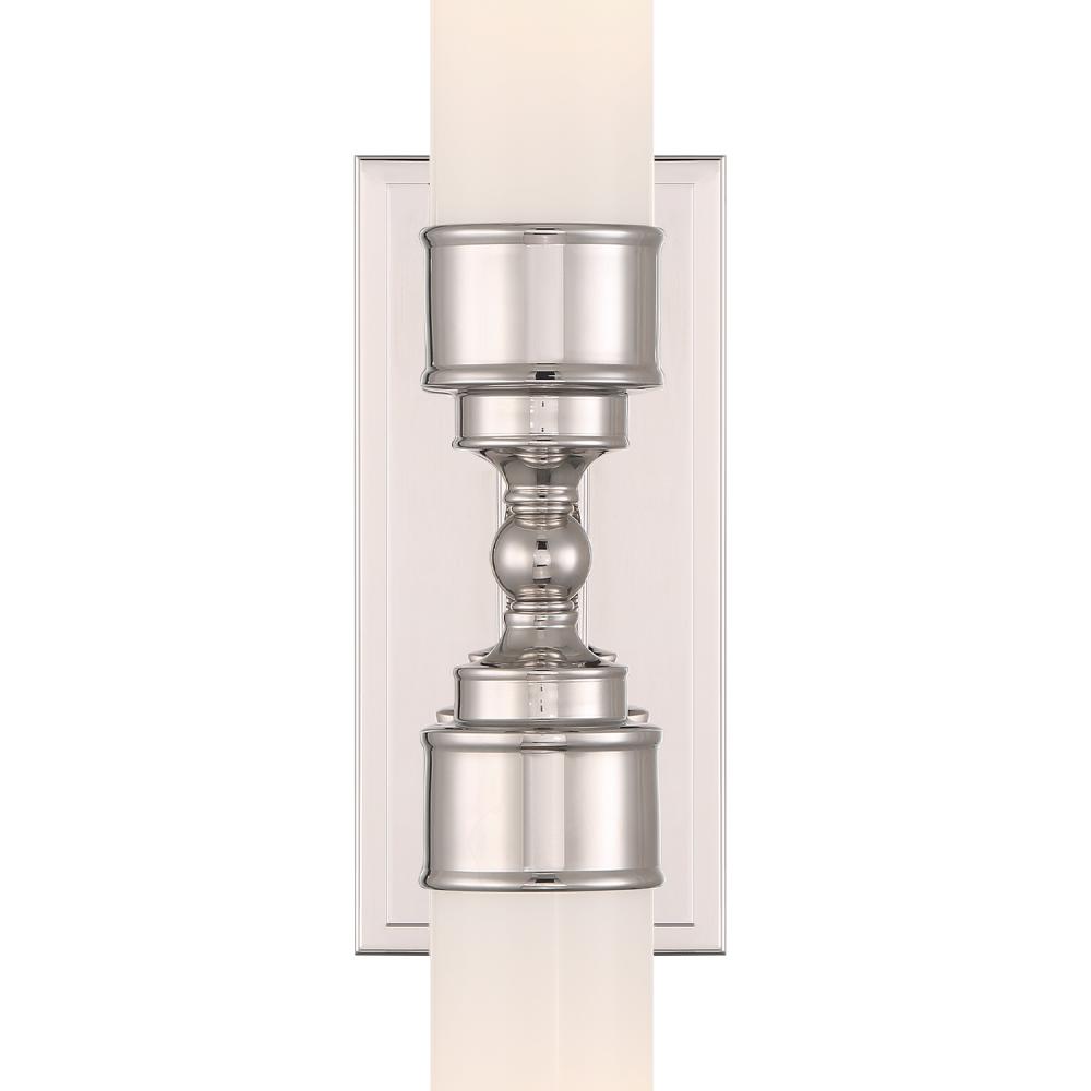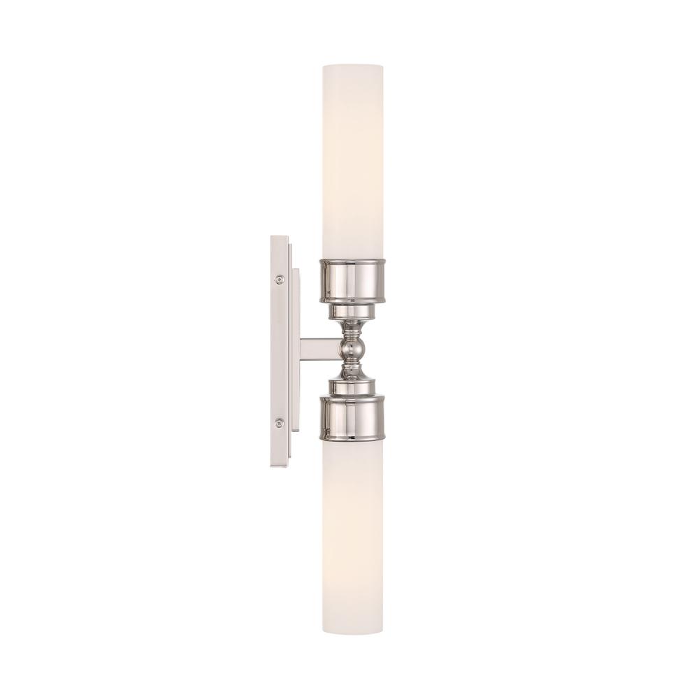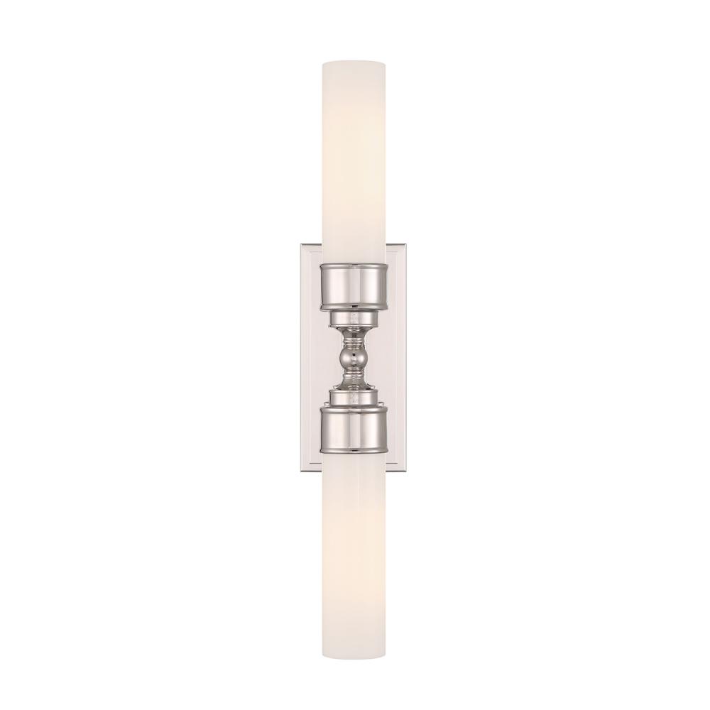 The Wilcox collection includes a white cylindrical glass shade and a rectangular back plate with stepped detailing. It is damp-listed for safe use in moisture-prone areas. The collection offers a single light option, suitable for mounting on either side of a mirror, and a double light option, perfect for placing over a vanity. This elegant fixture adds a sophisticated touch to bathroom spaces.