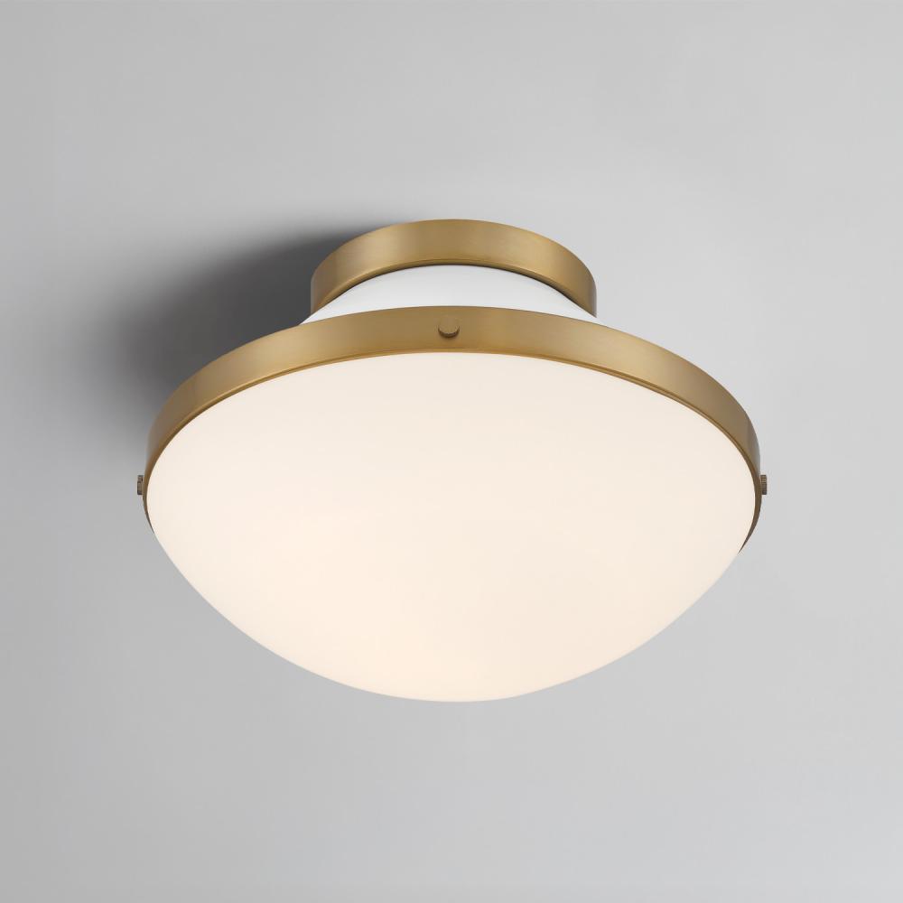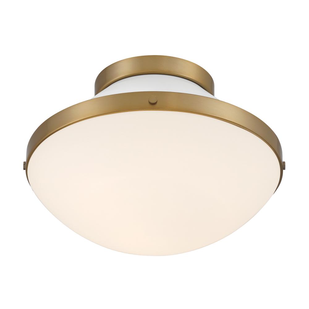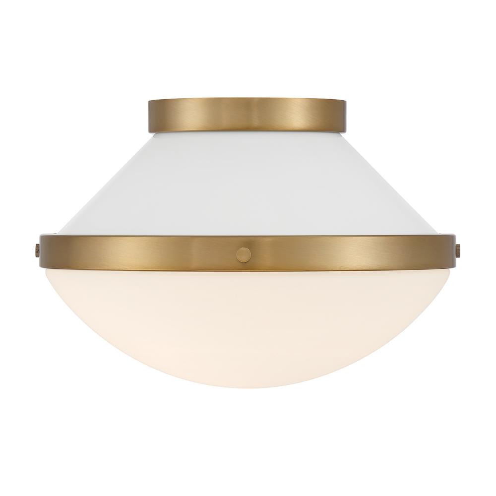 The Xander collection features a playful, mid-century-inspired design with clean lines and fun pops of color. It has white opal glass and gold accents, creating a two-toned finish that adds a touch of whimsy. This versatile fixture can be used in various settings, making it a stylish and functional addition to any room.