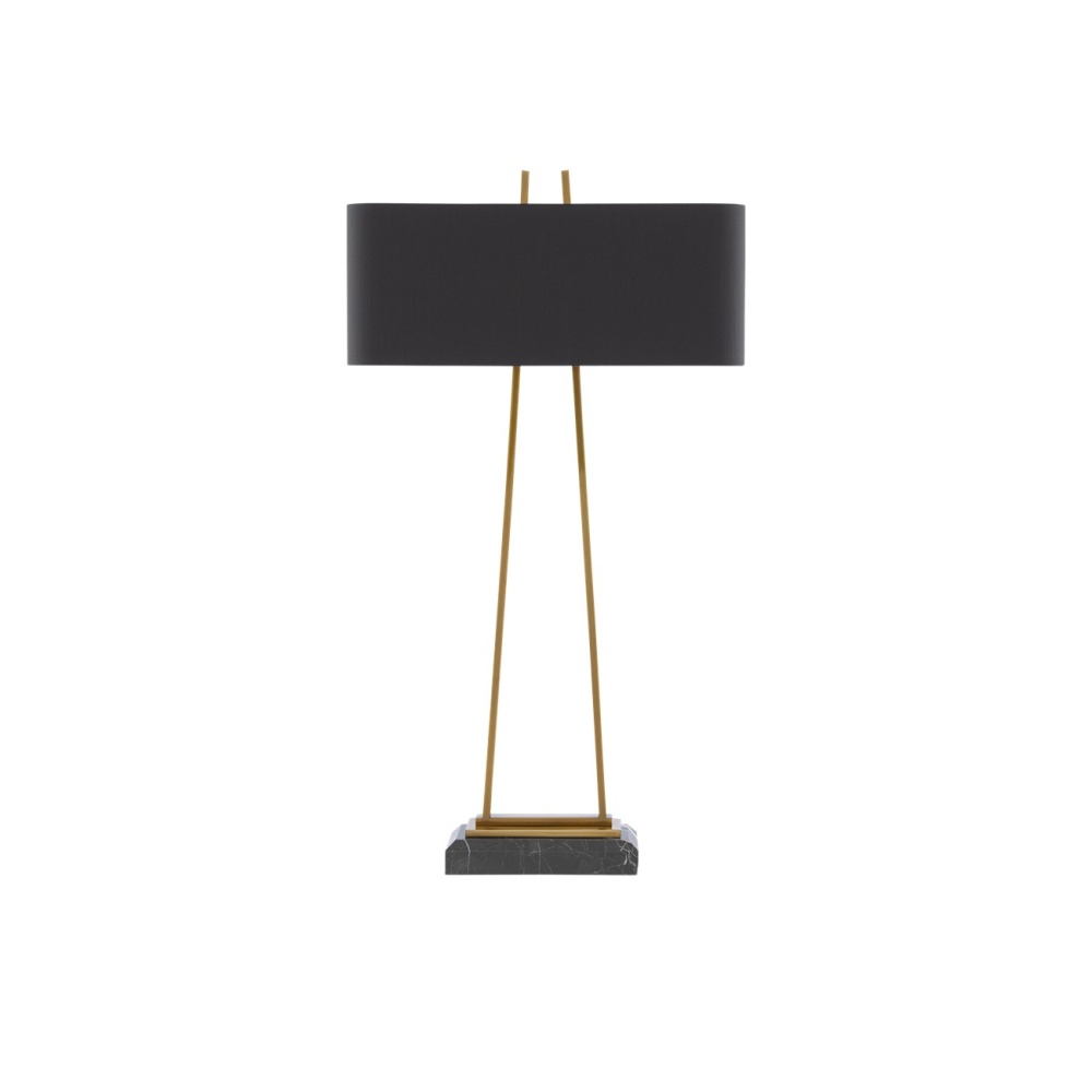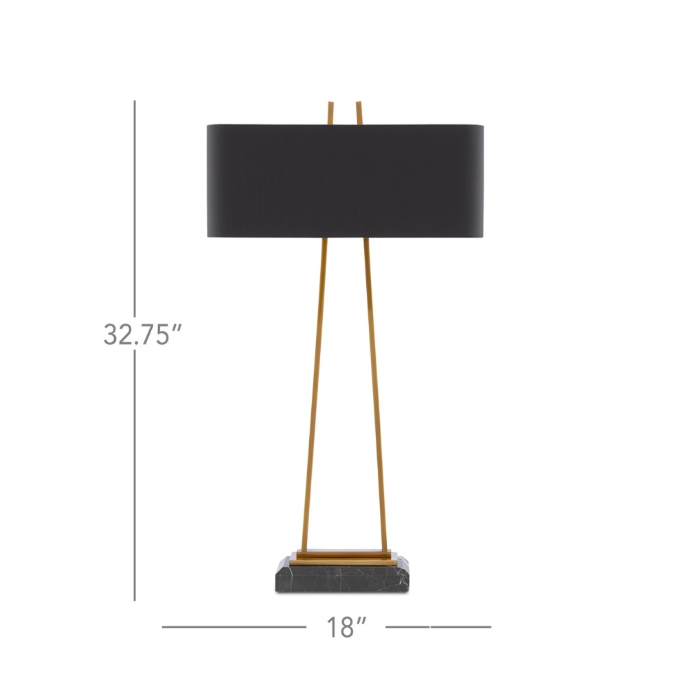 Our Adorn Large Table Lamp has a thin metal frame in an antique brass finish that culminates with an unfinished pyramid shape in the matching finial. The black marble base is a luxurious touch and the black shantung shade with its gold lining brings this gold lamp added beauty.