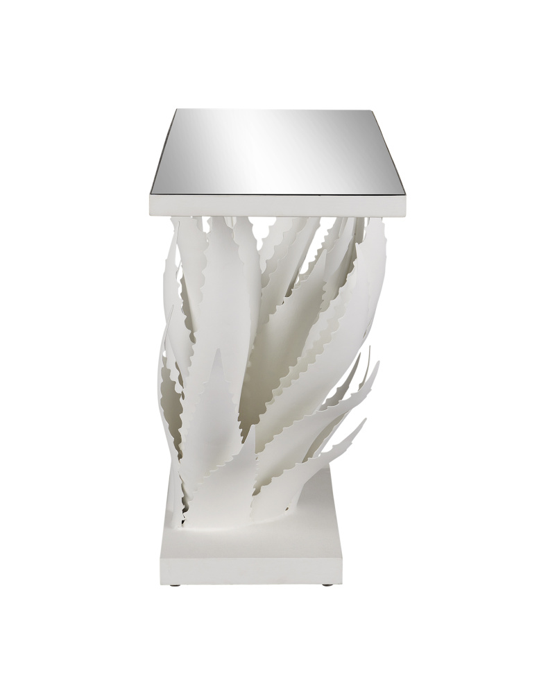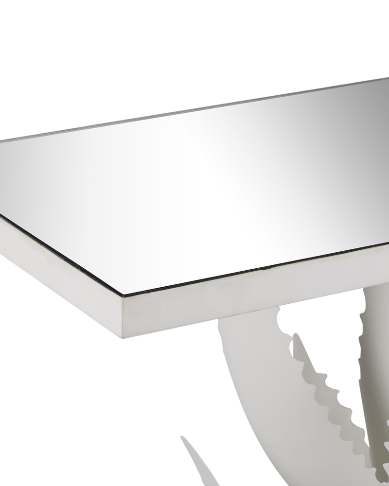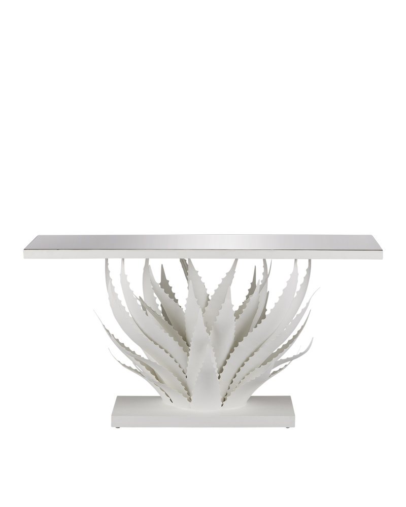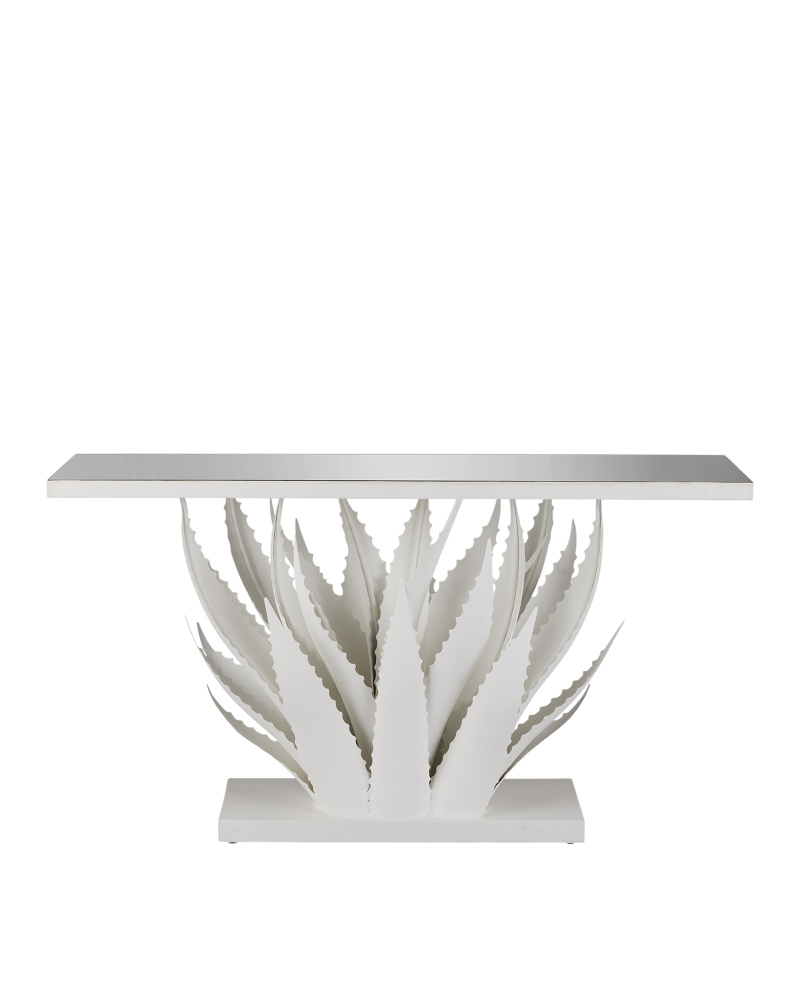 The Agave White Console Table was inspired by the flourishing plant of the same name, whose spiky, leathery fronds curl up from the ground just as the oversized leaves on this white console table do. “My love of the Agave plant, of which hundreds of varieties flourish in the Yucatan, has inspired me for many years,” says the table’s designer Marjorie Skouras. Her passion for the Yucatan peninsula, the surroundings in which she lives and through which she translates the flora and fauna into dynamic products in her studio, shines in this wrought iron table covered in a crisp gesso white finish with a mirrored top.