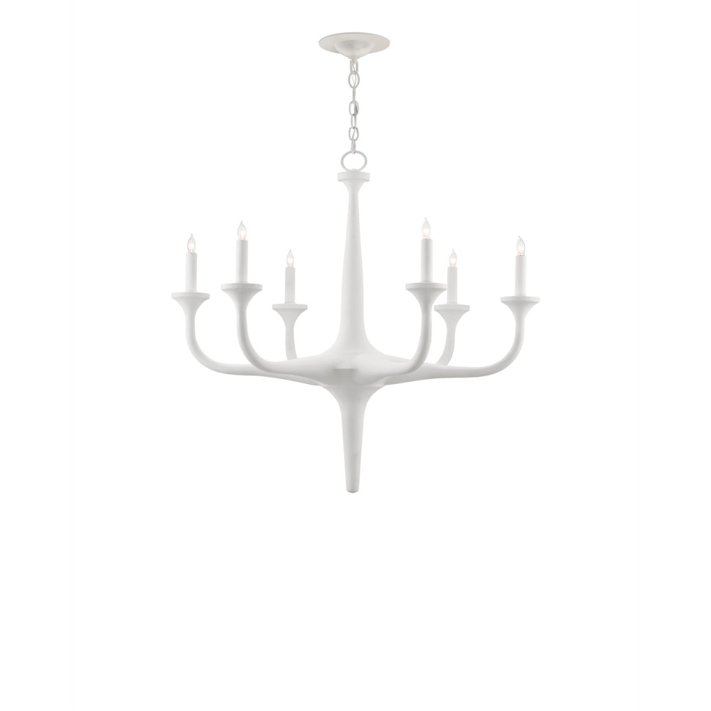 The Albion Chandelier is one of our creations that shows off our skill with finishes, the wrought iron fixture so smoothly covered in gesso white that it reads like it has been sculpted from a pliable material. The six-light chandelier is seriously flexible in the number of stylistic notes it can manage, its snowy countenance perfect for rooms as diverse as Hollywood glamour to cleanly contemporary.