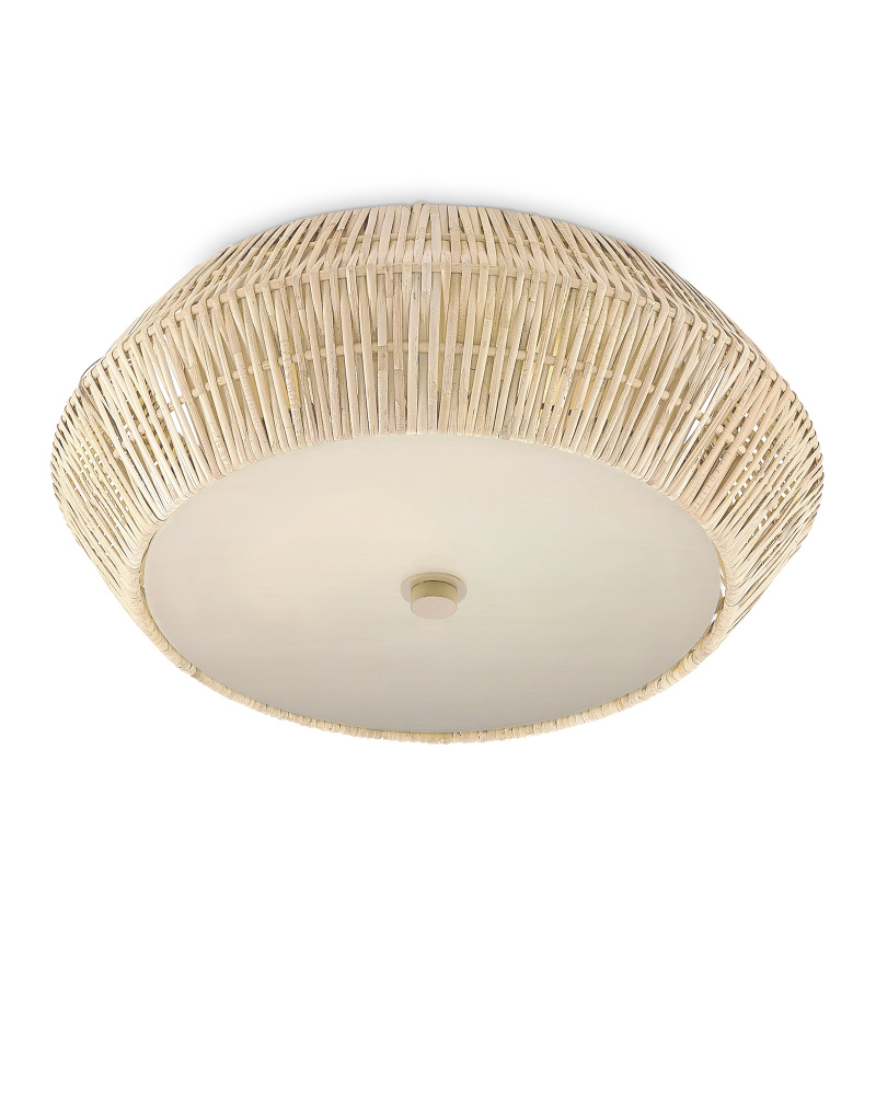 Painstakingly woven by artisans who use traditional techniques, the Antibes White Flush Mount is a marriage of artistry and high-quality construction. Natural bleached rattan flows along the exterior of the flush mount shaped by a wrought iron frame in a snow-white finish. Two lights reflect through the acrylic diffuser to create a soft glow.