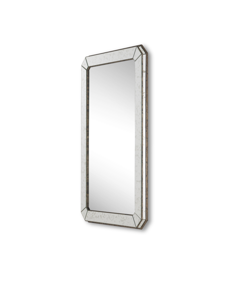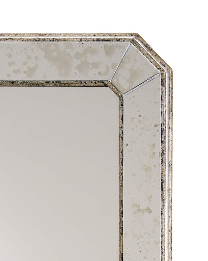 Dexterously antiqued wood stealthily surrounds the interior and exterior edges of the antique mirror frame on the appropriately named Antiqued Wall Mirror. This piece, which projects the clean lines that fans of mirrored furniture love, can be hung vertically or horizontally with the metal cleat that is supplied with the mirror. The antiquing of the frame proves the talent our finish artisans bring to their work. The mottled surface will add extra luminosity to the spot on the wall held by this beauty. There are a number of other pieces in this lovely family of products.