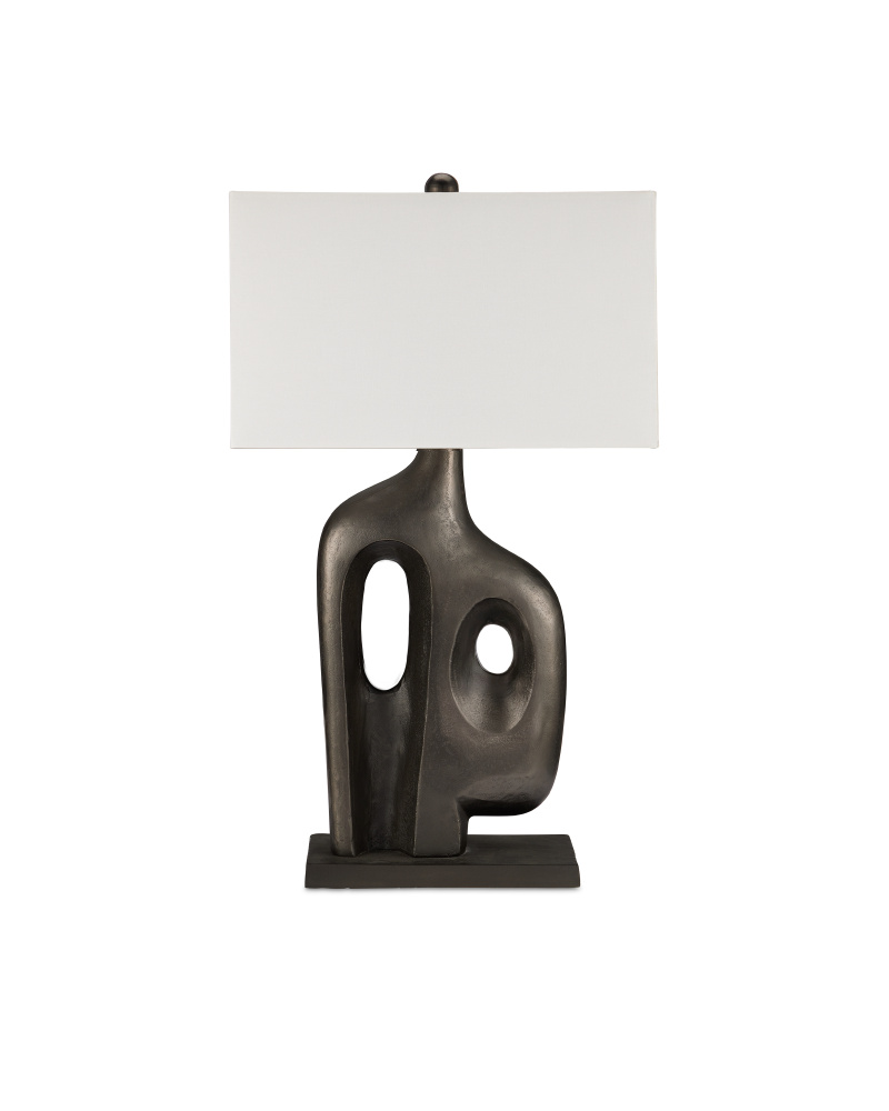 The Avant-Garde Table Lamp has a mid-century-modern inspired body, the flowing form leaning a bit toward brutalist in design. The lamp is made of aluminum in a graphite finish that brings the profile heft. The base and finial match the sculptural piece, and the bone linen shade is a pale contrasting element.