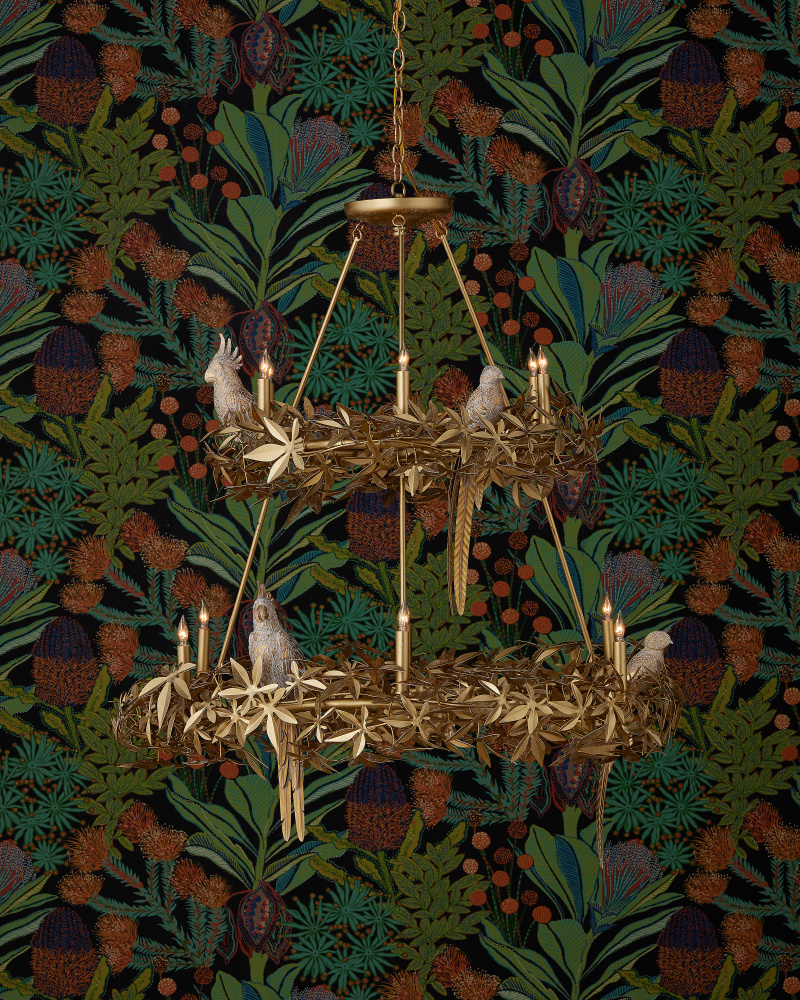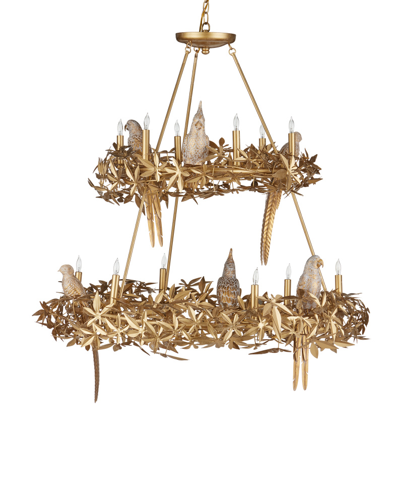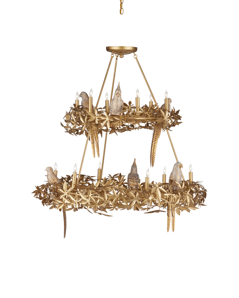 The Aviary Gold Two-Tier Chandelier is a gleaming example of sophisticated biophilic design. Inspired by an antique fixture, the gold chandelier has flowing leaf and floral motifs in a Swedish Gold finish that match the tails of birds perching within the foliage. Originally carved by a sculptor, the cockatiels, sparrows, and macaws were carefully recreated out of composite to match the original works of art. The 12-light chandelier is dimmable. Adjustable from 45.5" to 121.5" with use of included chain/rod kit/cable. If your space calls for a longer drop, additional chain/rods/cable is available for purchase.