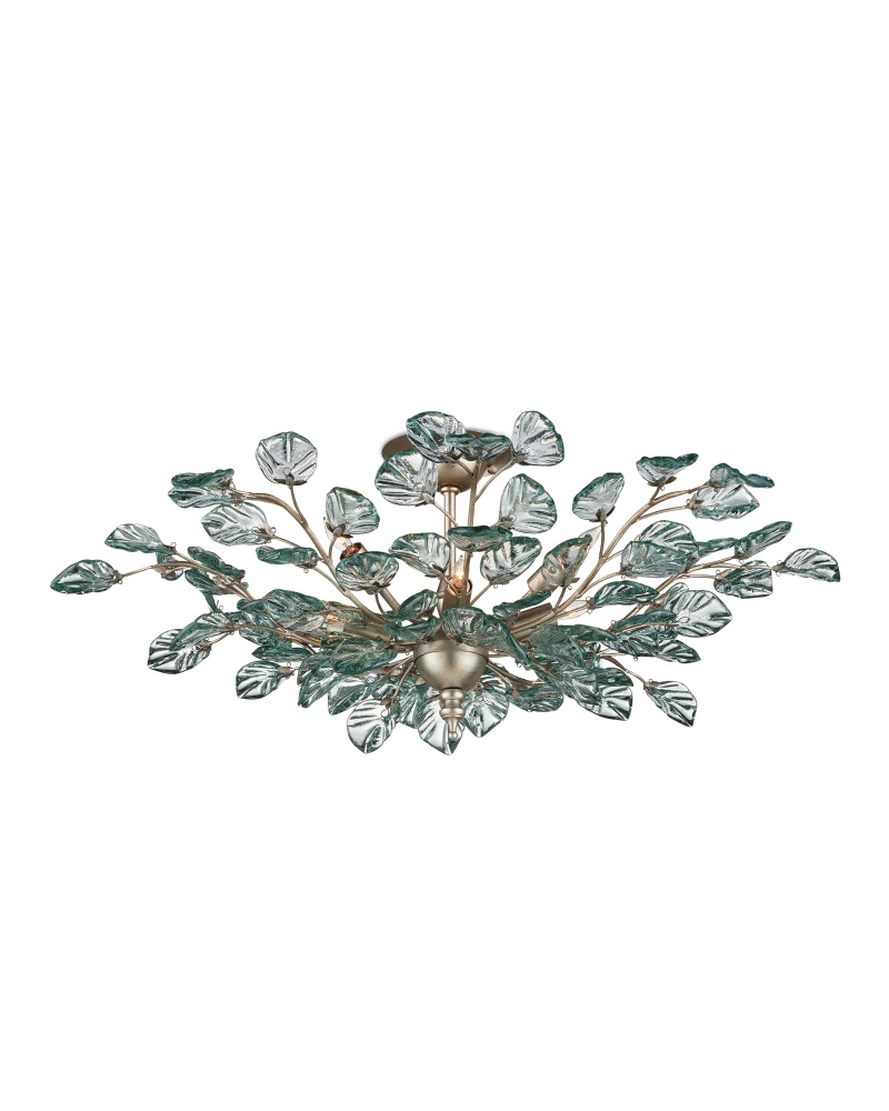 The Baobab Semi-Flush Mount has luminous leaves that are made of recycled glass and pressed into shape. The biophilic design is made even more graceful by the placement of the glass pieces that seem to be fluttering in a breeze. These are attached to wrought iron stems in a contemporary silver leaf finish that gleams beautifully.