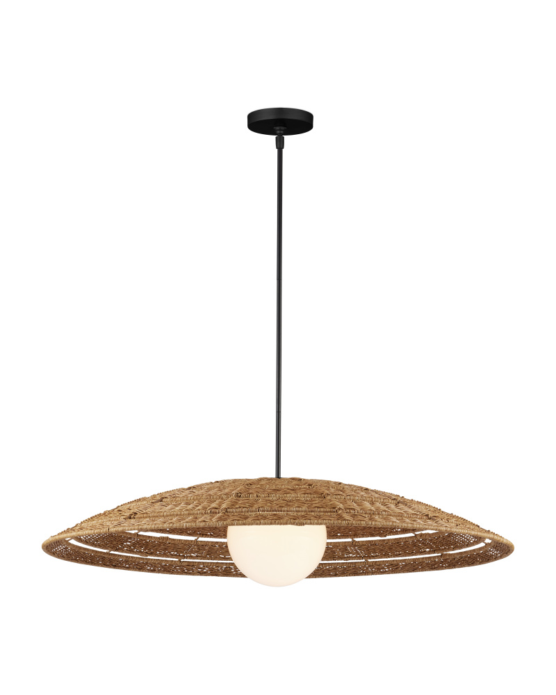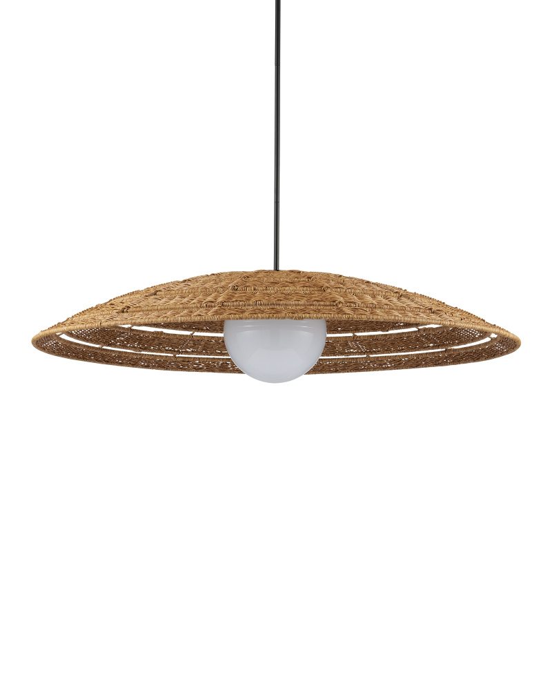 The Barbary Outdoor Pendant has an inverted bowl-shaped shade made of all-weather wicker that can easily withstand the elements, as will the rod from which it hangs in a black powder-coated finish. The uniform weave on the tan pendant is painstakingly achieved by hand, and a sophisticated detail is how the milk-glass globe on the one-light pendant glows through the circular cut out. The Barbary is wet location-tested so it is ideal for illuminating patios and porches. Adjustable from 17" to 59" with use of included chain/rod kit/cable. If your space calls for a longer drop, additional chain/rods/cable is available for purchase.