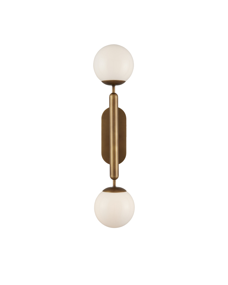 The Barbican Double-Light Brass Wall Sconce features a tubular stem that balances cup-like shapes into which translucent glass globes nestle. Keeping the design minimal, the button-like hardware is as streamlined as possible. This gold sconce is included in our Bagno Collection of damp-rated lighting, designed specifically for bathrooms. The Barbican can also be mounted sideways to fit over a mirror.