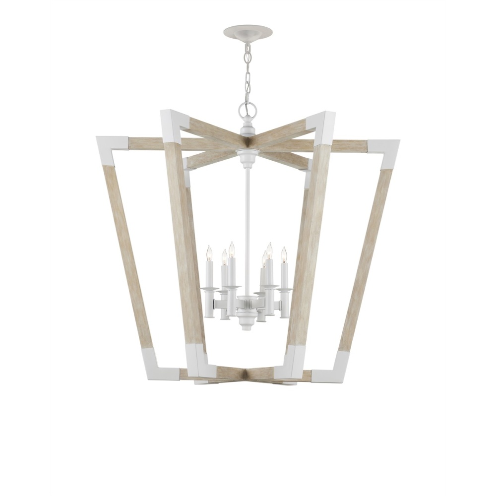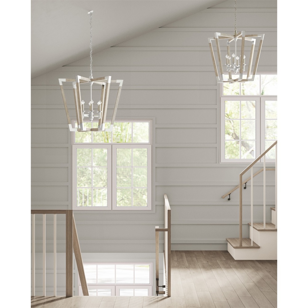 The Arts & Crafts movement inspired the design of the Bastian Large Sandstone Lantern, which is made of wrought iron and wood in sugar white and sandstone finishes. The crisp feel of the white metal clasping the spokes of washed wood brings extra sophistication to this lantern-shaped chandelier. Adjustable from 41" to 109" with use of included chain/rod kit/cable. If your space calls for a longer drop, additional chain/rods/cable is available for purchase.