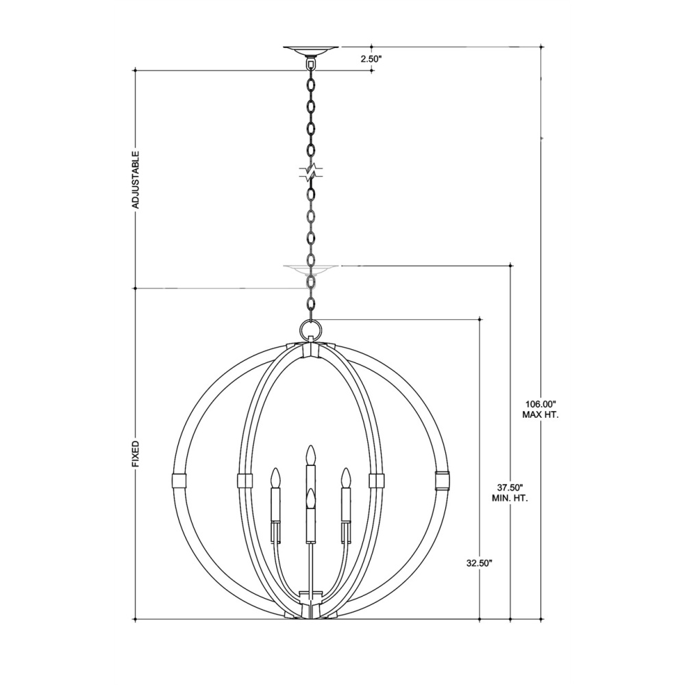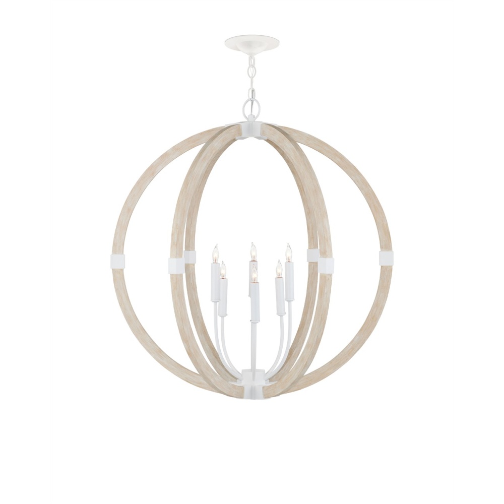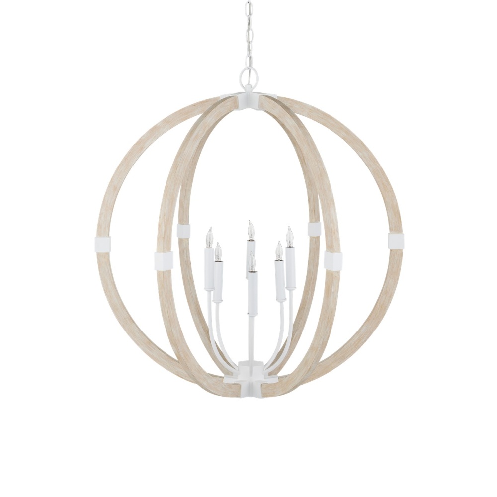 The Arts & Crafts movement inspired the design of the Bastian Sandstone Orb Chandelier, which is made of wrought iron and wood in sugar white and sandstone finishes. The crisp feel of the white metal clasping the spokes of washed wood brings extra sophistication to this fixture. The pale finishes on this bleached-wood chandelier bring the classic shape a sense of modernity. Adjustable from 37.5" to 106" with use of included chain/rod kit/cable. If your space calls for a longer drop, additional chain/rods/cable is available for purchase.