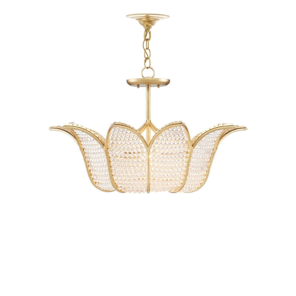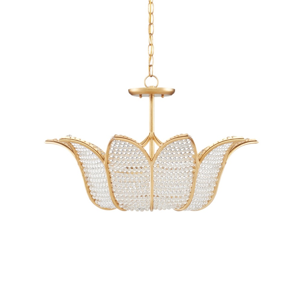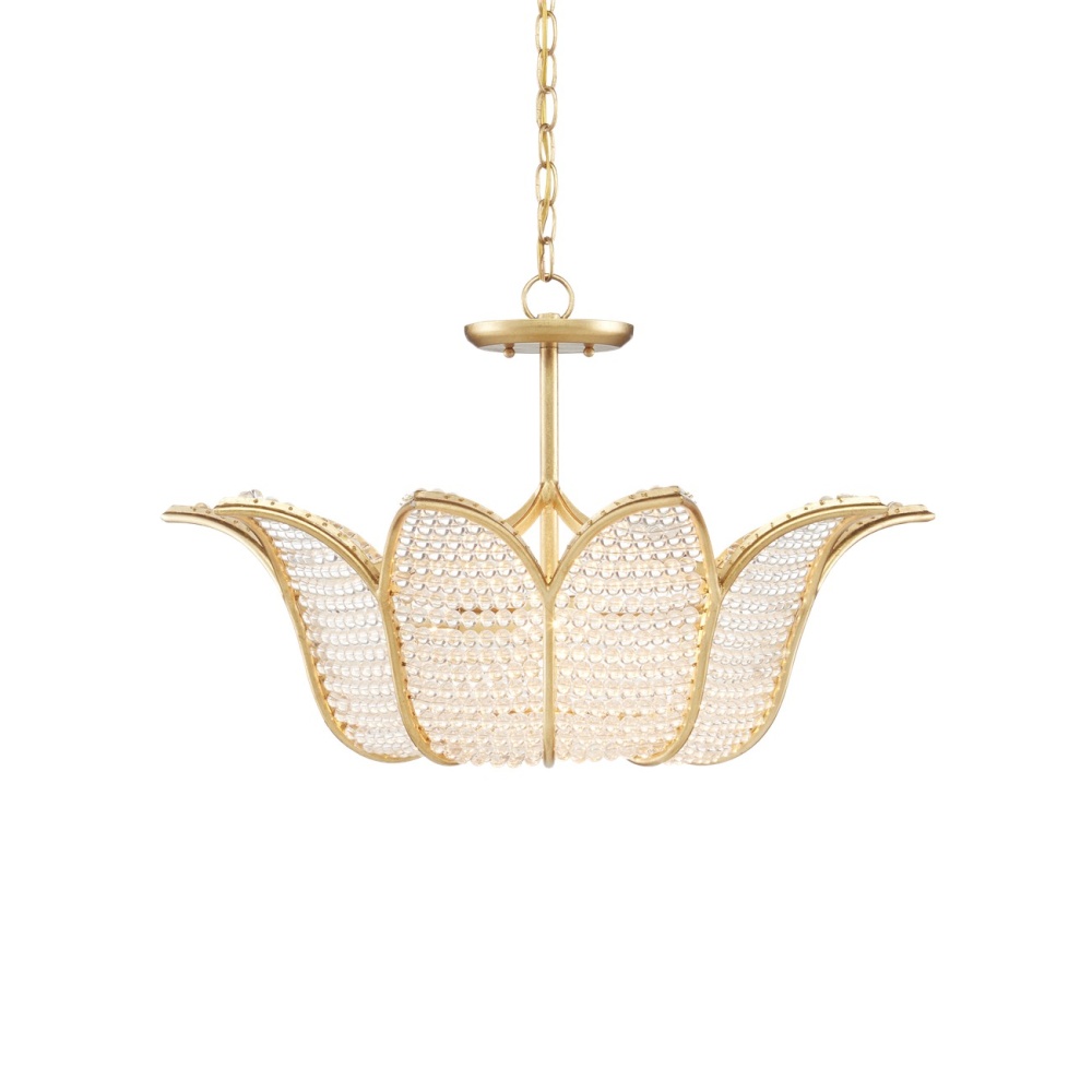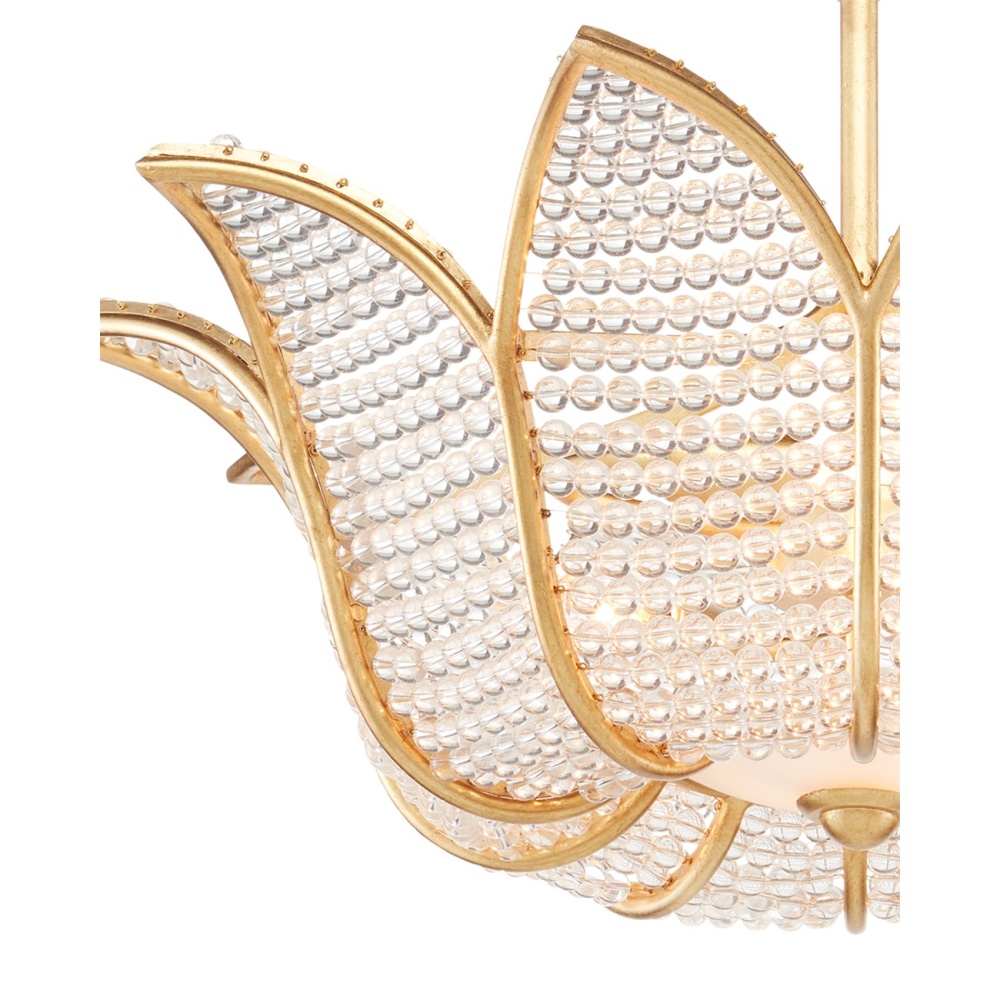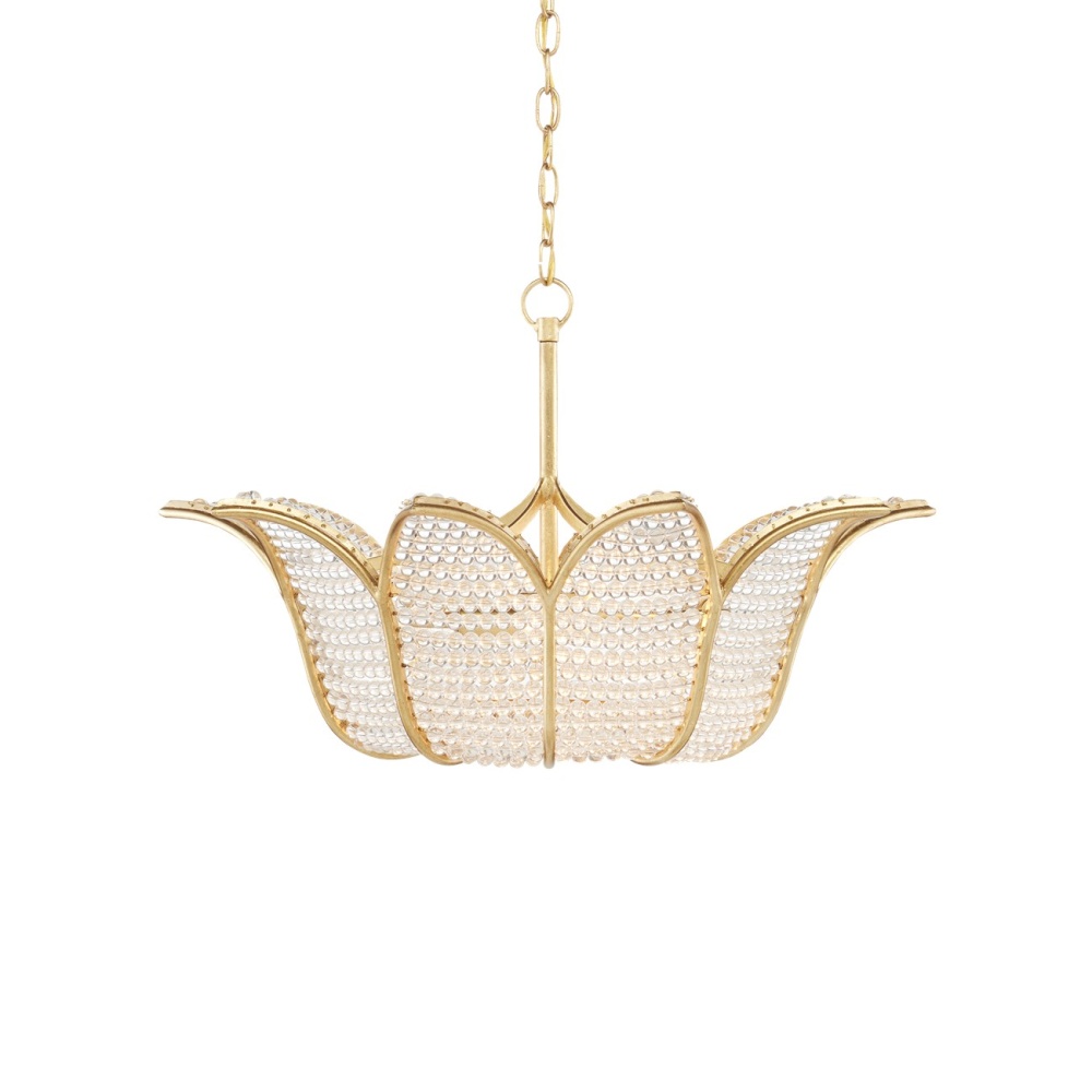 A throw-back to a time when formal salons were the most popular gathering spots for the elite, the Bebe Chandelier designed by Bunny Williams has a wrought iron tulip-shaped frame in a contemporary gold leaf finish strung with clear glass beads. The light effervesces when it passes through the small glass globes to soften the illumination that flows from this gold chandelier. Adjustable from 23.75" to 91.5" with use of included chain/rod kit/cable. If your space calls for a longer drop, additional chain/rods/cable is available for purchase.