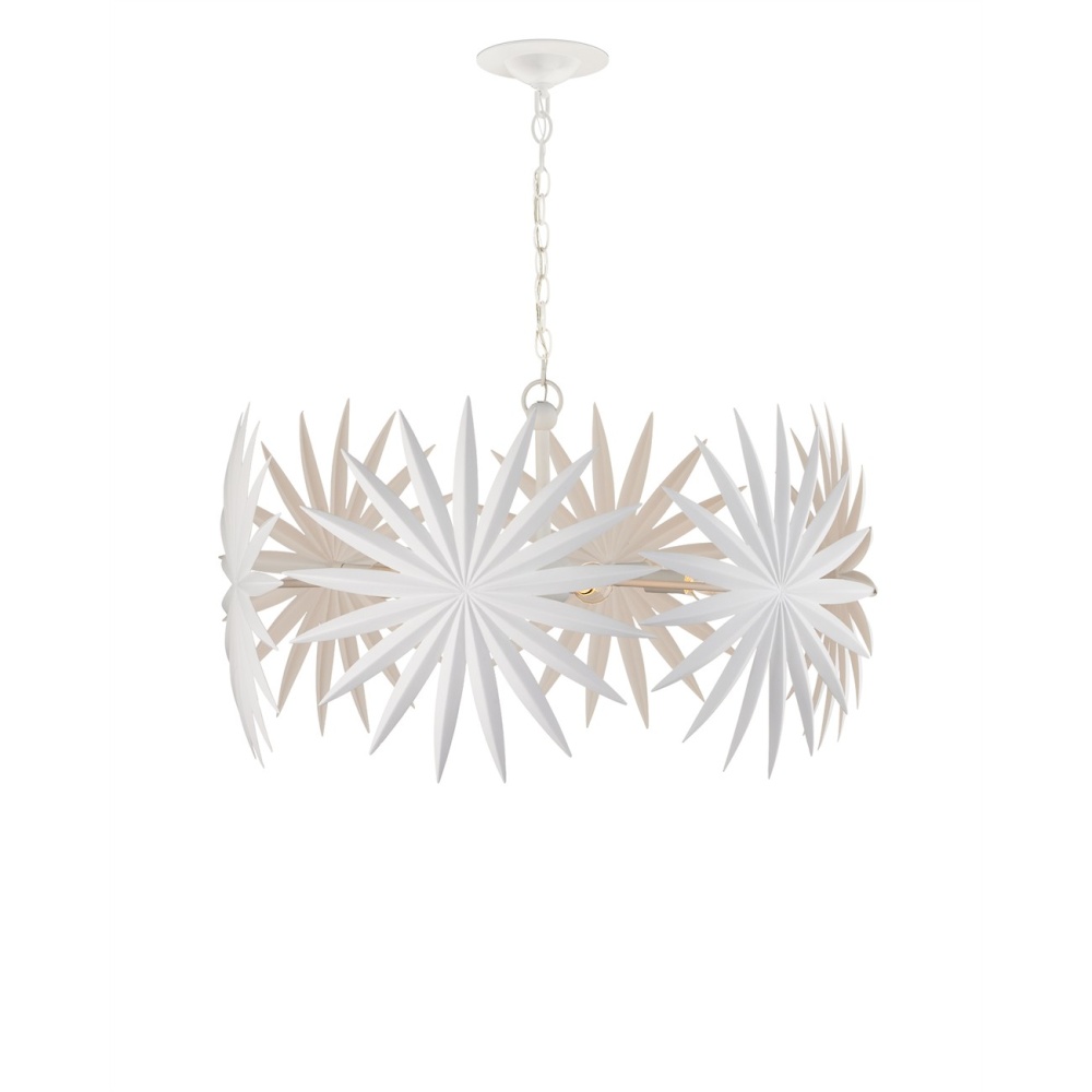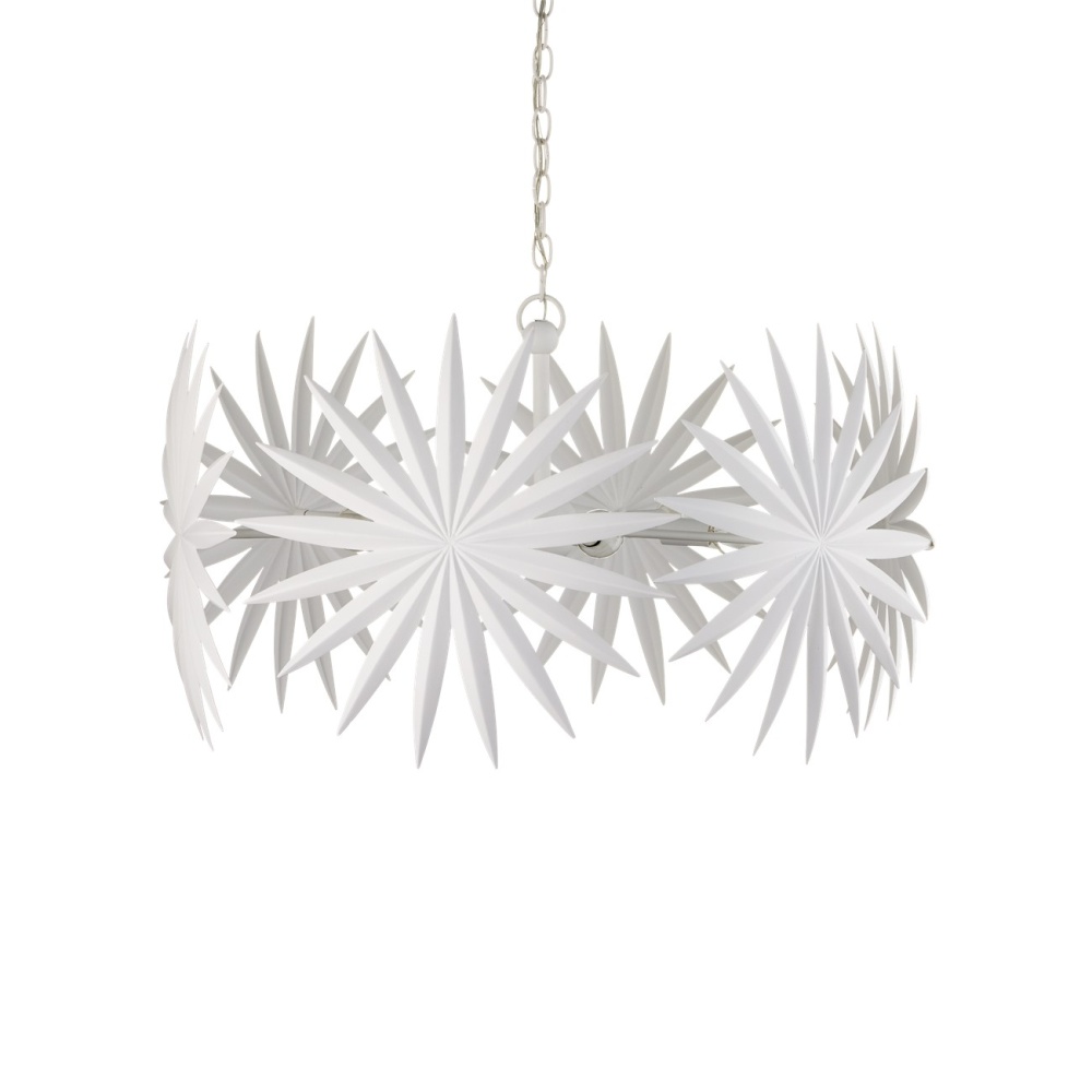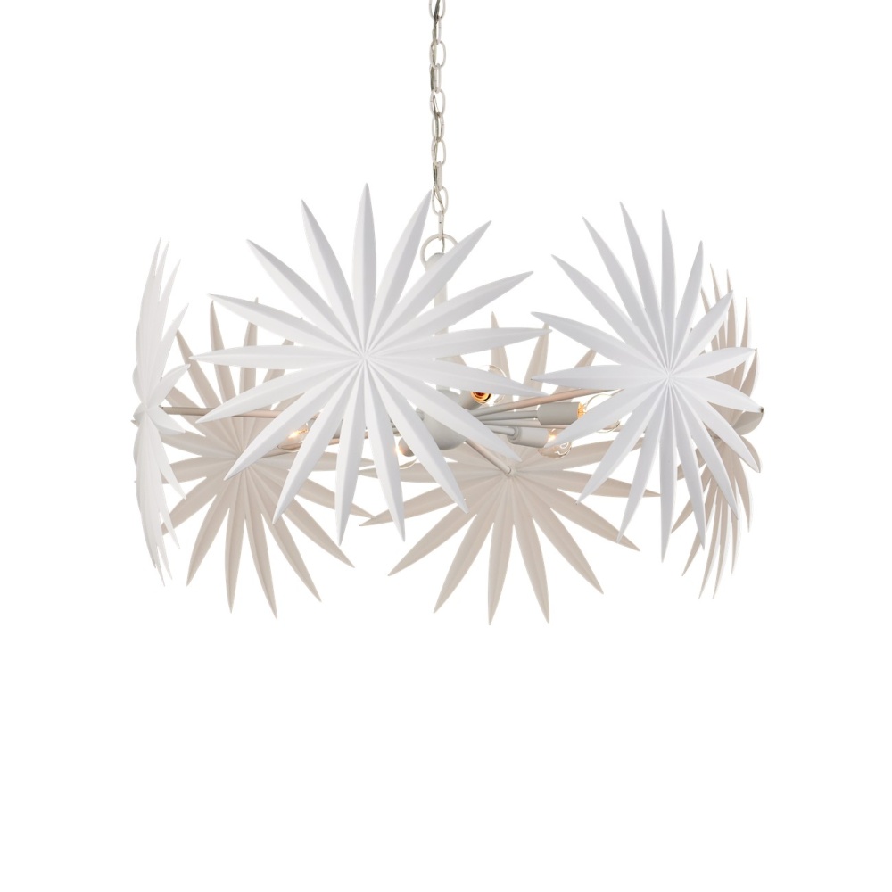 The Bismarkia Small Chandelier was inspired by the noble Bismarkia palm, with its oversized fronds. Marjorie Skouras, who designed the chandelier, has stayed true to her love of nature for this creation. Her passion for the Yucatan, the surroundings in which she lives and through which she translates the flora and fauna into dynamic products in her studio, shines in this steel fixture covered in gesso white. The spiky ornamentations that splay around the bulbs bring immediate texture to the white chandelier. Adjustable from 25.5" to 93.5" with use of included chain/rod kit/cable. If your space calls for a longer drop, additional chain/rods/cable is available for purchase.