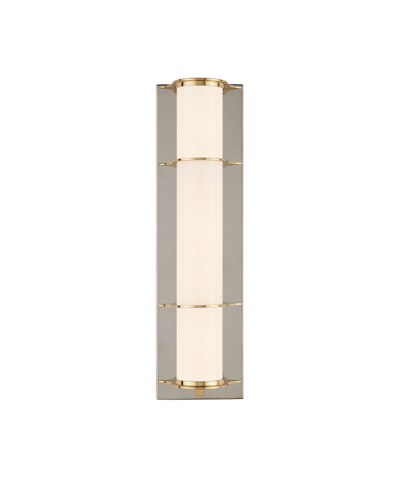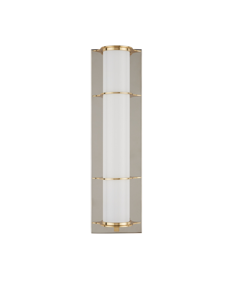 The Blaine Nickel Bath Wall Sconce has a tubular design, with a milky glass tube set into the metal rings in a polished brass finish that contrast the wallplate in a polished nickel finish. Perfect for lighting up a bathroom vanity, the Blaine has a simple design that will work well within a number of design styles.