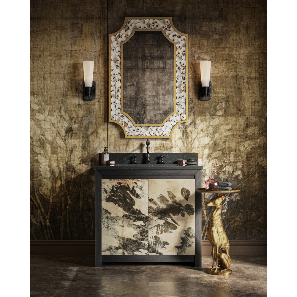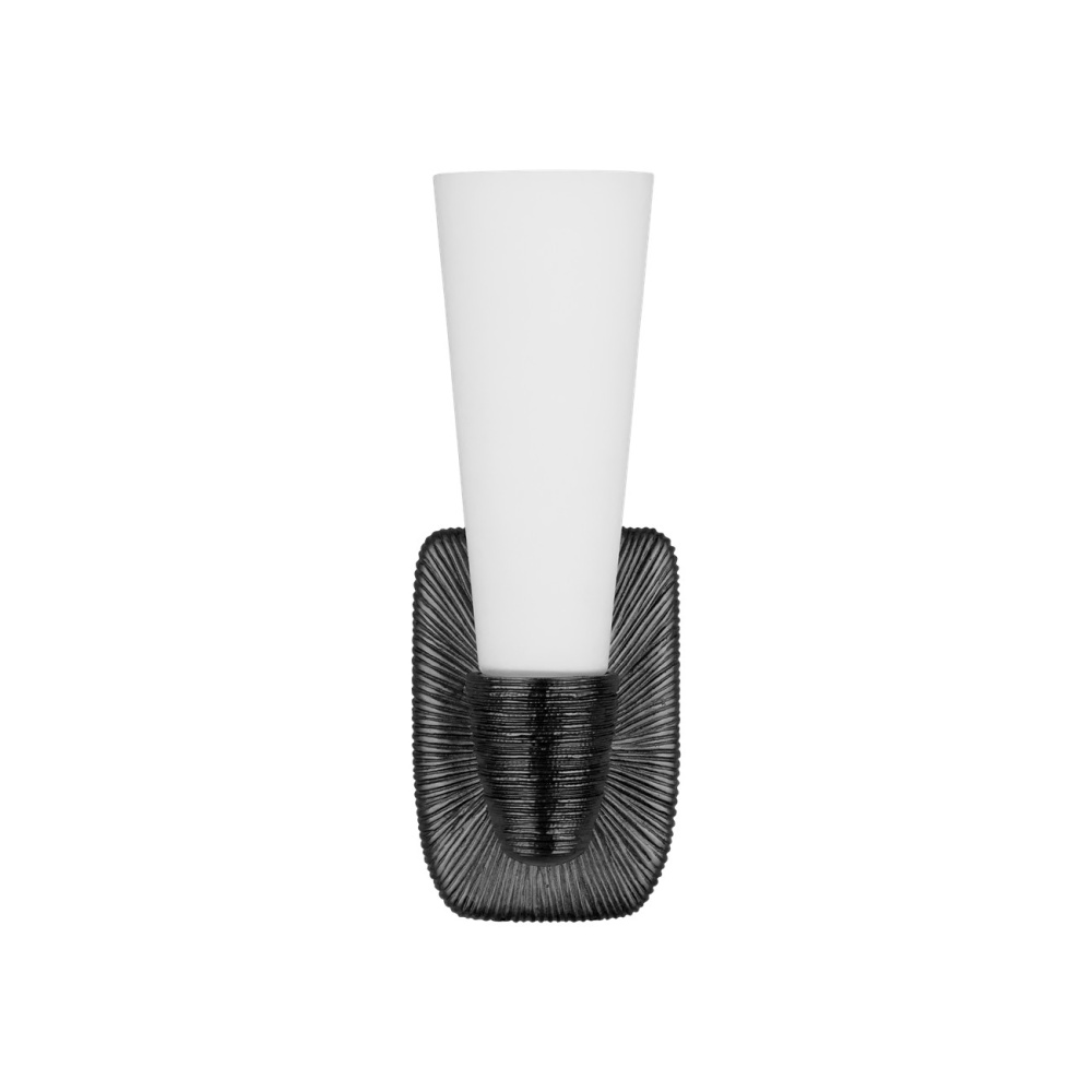The Bonaz Bronze Bath Wall Sconce is made of cast brass with tremendous texture on its metal surfaces that resemble flowing strands of hair pulled tightly into a bun. The white glass globe, which extends up from the wallplate, creates a glow that contrasts the metal in an oil-rubbed bronze finish. The one-light sconce, which is 14 inches tall, is dimmable and damp rated.
