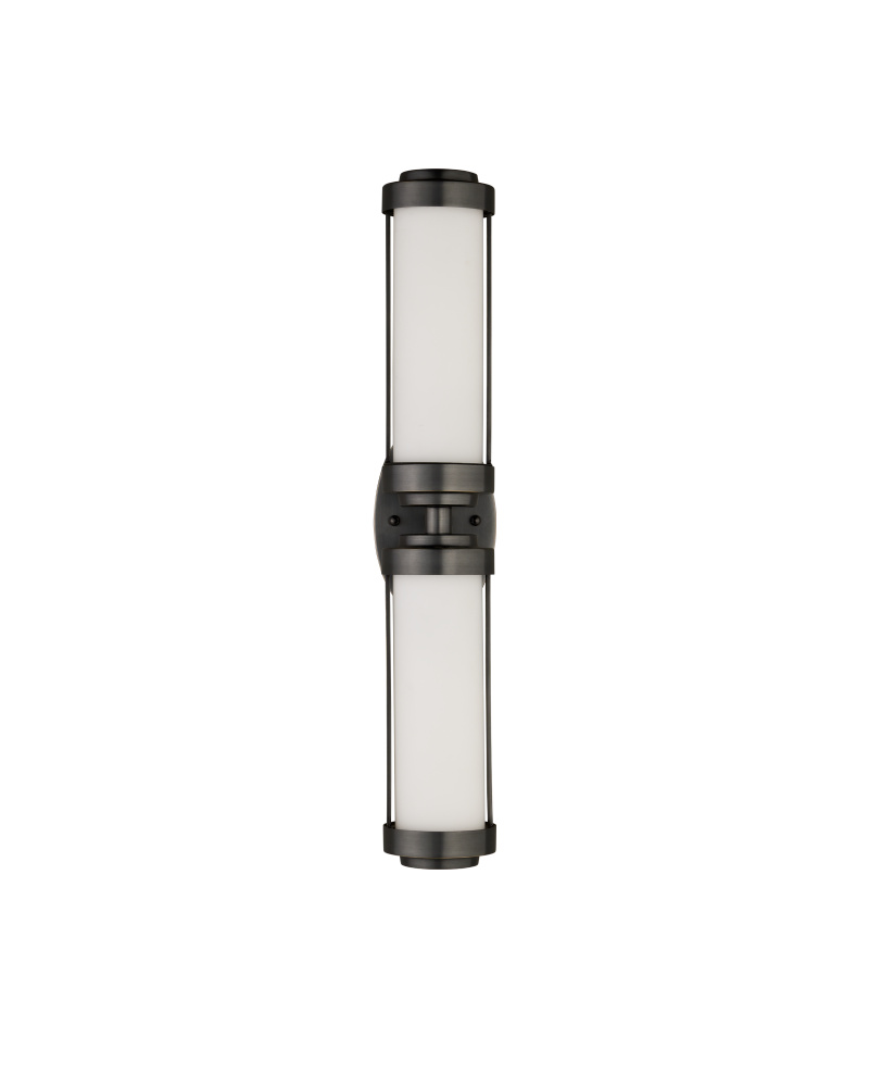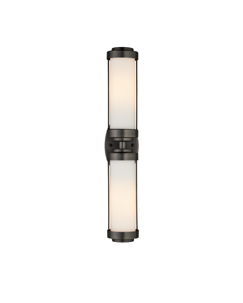 The Bowland Bronze Bath Wall Sconce features a contemporized hourglass shape designed with a fresh, modern feel. Inspired by an antique fixture, the time-honored profile is updated with sleek caps surrounding the opaque glass tubes at the top and bottom. The articulate center transition between the two elements further enhances this modernization. The metal on this sconce is in an oil-rubbed bronze finish.