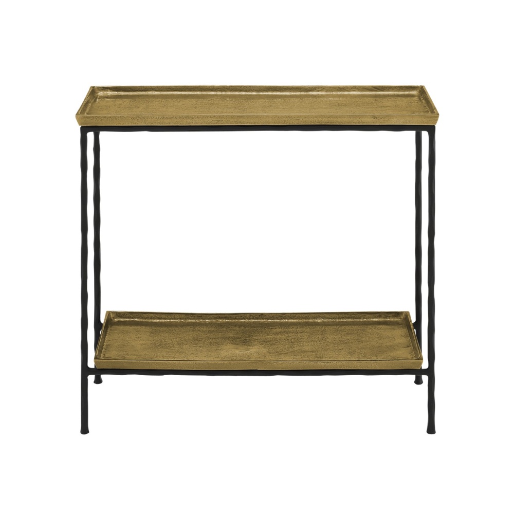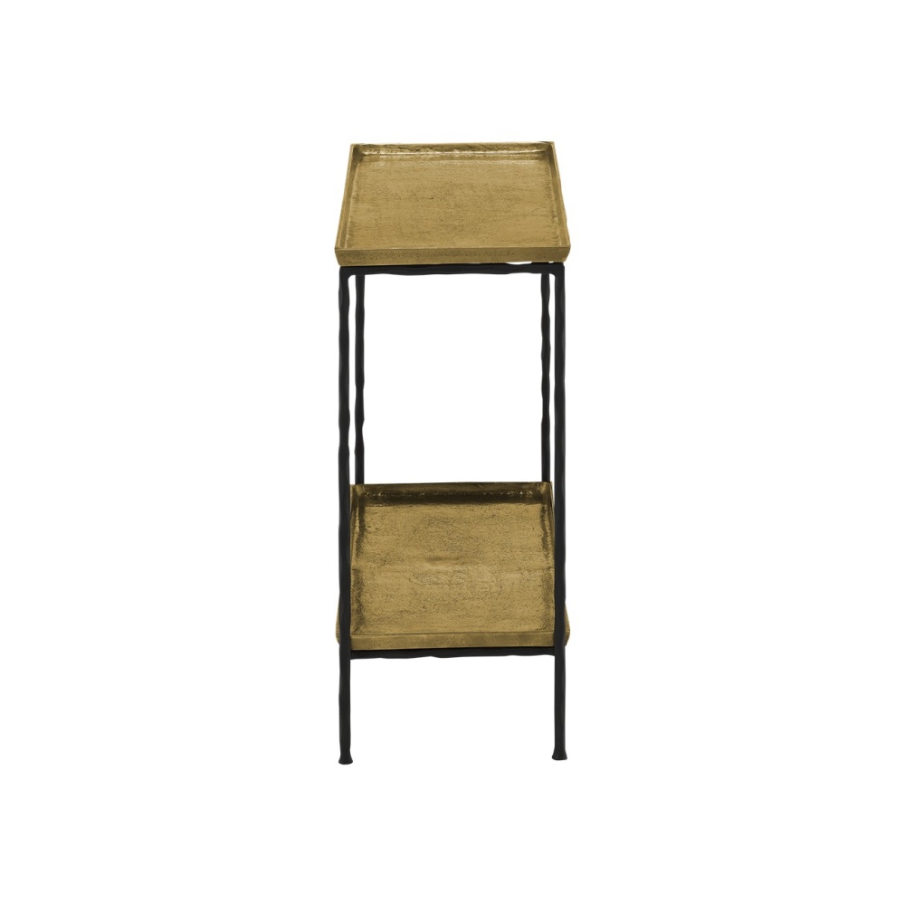 The Boyles Brass Side Table has a profile that is so handsome you may think twice about disturbing its good looks with accessories. The simple iron base that has been treated to a black forged finish proudly lifts its aluminum tray-like top in antique brass, which matches a bottom shelf in finish and shape. This side table is an expressive feature for any spot where a personality-packed table is needed. There are a number of products in an array of finishes in our Boyles offerings.