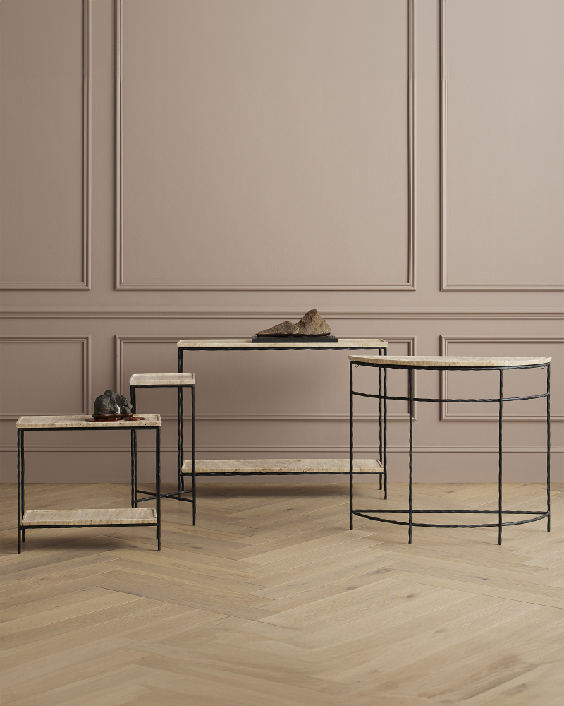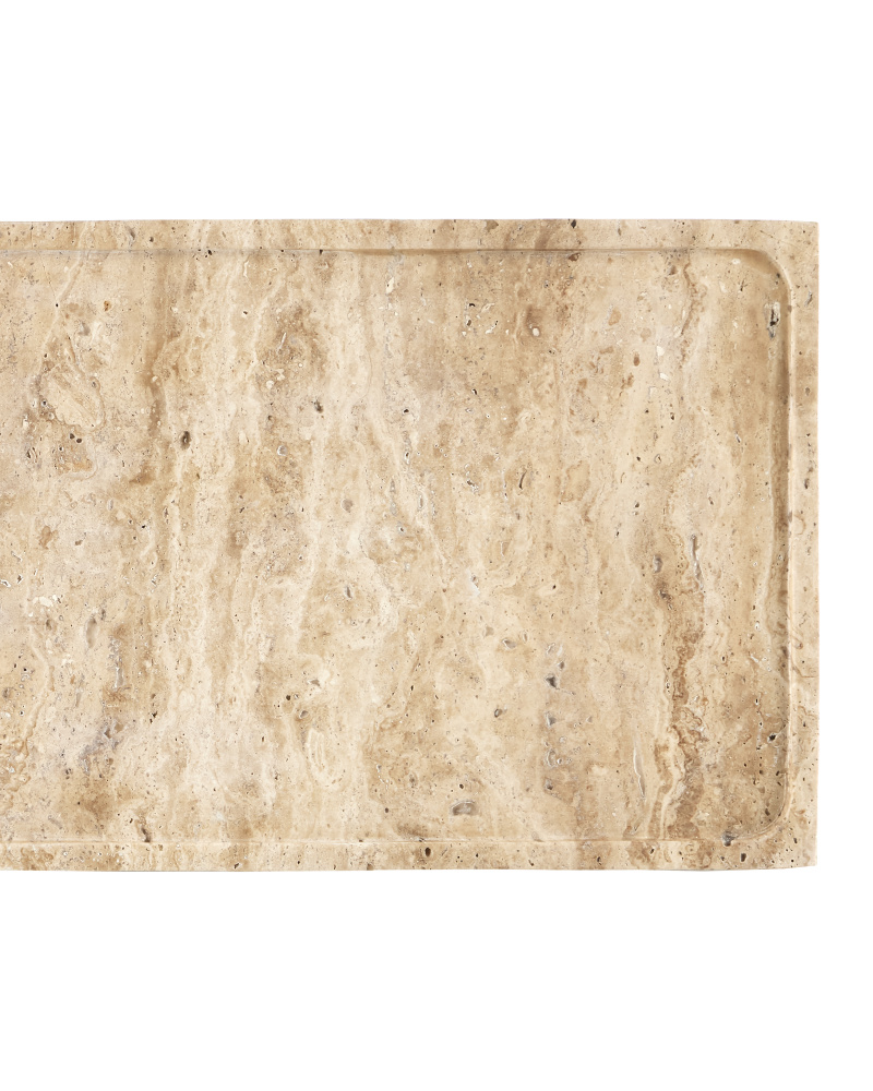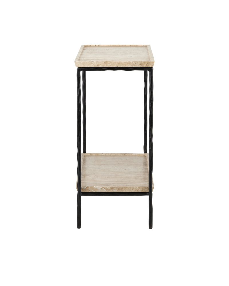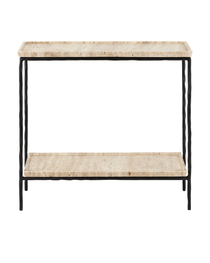 The Boyles Travertine Side Table has a forged iron base in a black finish that holds a tray top made of solid, unpolished travertine. The personality of the surface stems from the fact that it is porous and has a variety of nooks and crannies in its pitting. Inherent variations in the stone's texture, veining, and color - from pale ivory to a warm tan - are to be expected and celebrated. Each surface is unique so no two are exactly alike.
