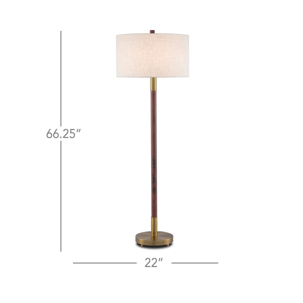 The Bravo Floor Lamp is a simple design made of rubberwood in a mahogany finish that is capped top and bottom by metal details in an antique brass finish. The finial is also made of rubberwood in a mahogany finish. It fastens the off-white linen shade to the wood floor lamp.