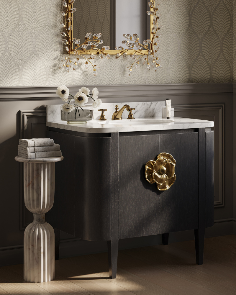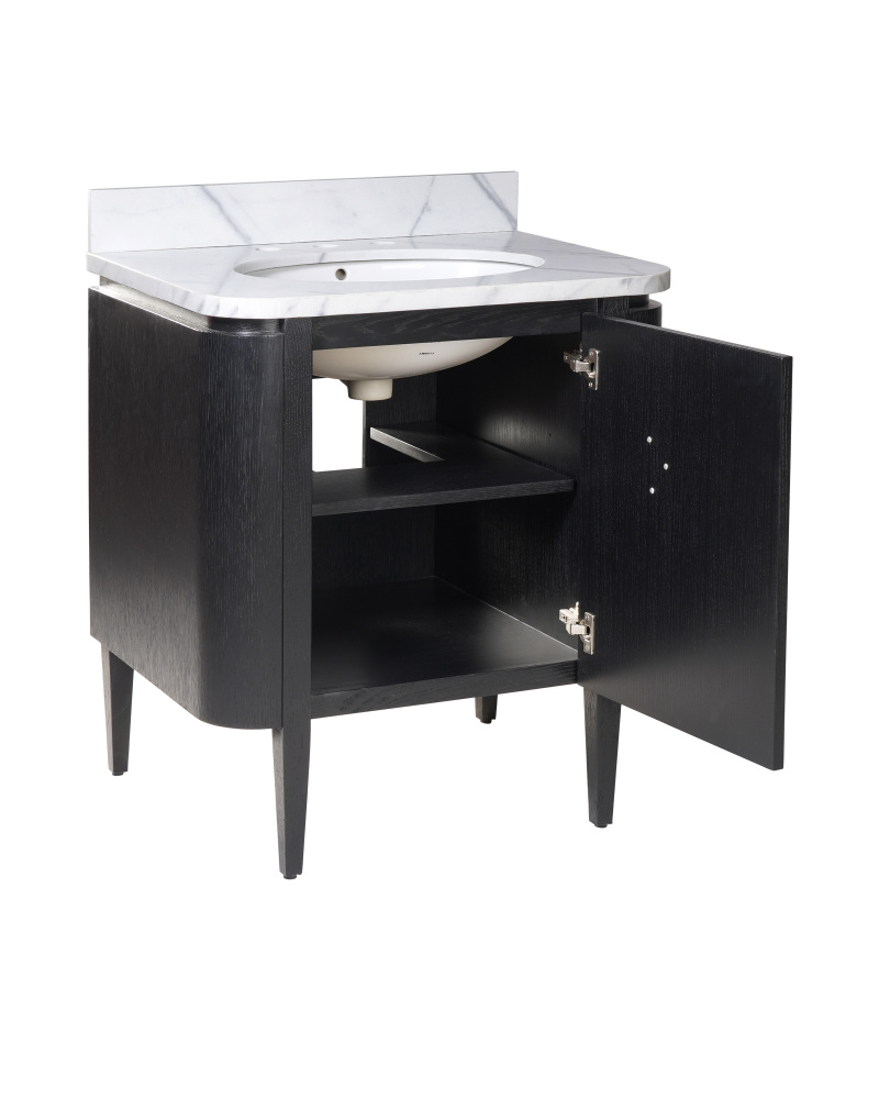 The impressively sized brass flower pull on the Briallen 30" Black Vanity is a stunning ornamentation that contrasts the caviar black finish. The interior has one adjustable shelf and there is an optional wood tray that attaches to the inside of the door. The white Carrara marble top is fitted with a white oval undermount sink. Other fine design attributes include soft-close door hinges and a matching marble backsplash.