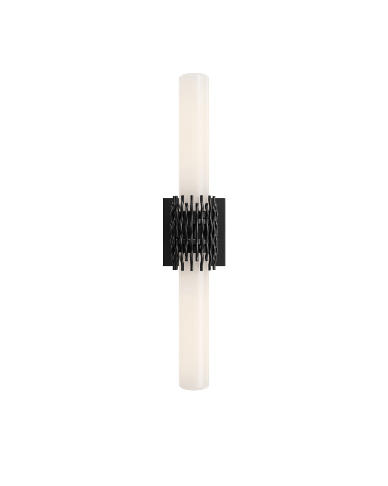 The Brietta Bronze Bath Wall Sconce, which is made of metal in an oil-rubbed bronze finish, is a study in textural movement and smooth stillness. The way the two milky glass tubes are designed to sit within the undulant wires is a sophisticated design detail, as they leave an open negative space in the middle. The black sconce, which is fitted with two bulbs that are elongated to fully light the tubes, is 23 inches tall, damp rated, and dimmable.