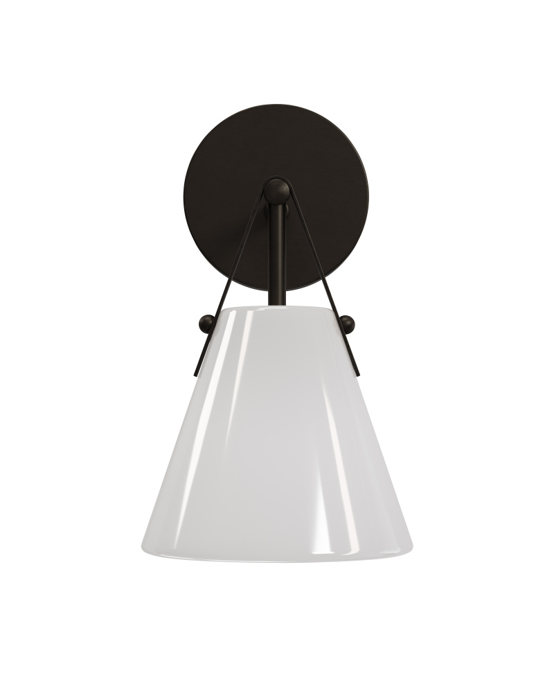 The Bronwen Bronze Bath Wall Sconce is an equestrian-inspired design with a flaring white glass shade fastened to the round wallplate with a sophisticated strap—a subtle nod to classic tack hardware. It can lean modern farmhouse, though it also complements other design styles. The metal in an oil-rubbed bronze finish is a nice contrast to the paleness of the shade, which has a glossy surface that glows. At nearly 12 inches tall, the one-light sconce is damp rated and dimmable.