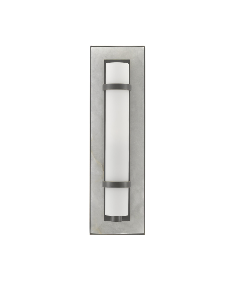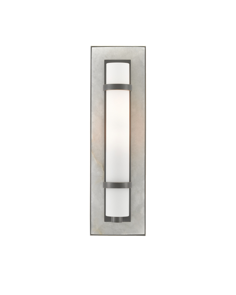 A masterful mix of materials describes the Bruneau Bronze Wall Sconce. From the cloudy alabaster panel affixed to the wall plate, the metal in a warm oil-rubbed bronze finish, and the soft glow of the opaque glass shade, the layering of this design is sophisticated. The strap-like circlets that fasten the shade to the wall plate on this black wall sconce is a design detail worth noting. Part of the Bagno Collection of wall sconces designed for bathroom spaces.