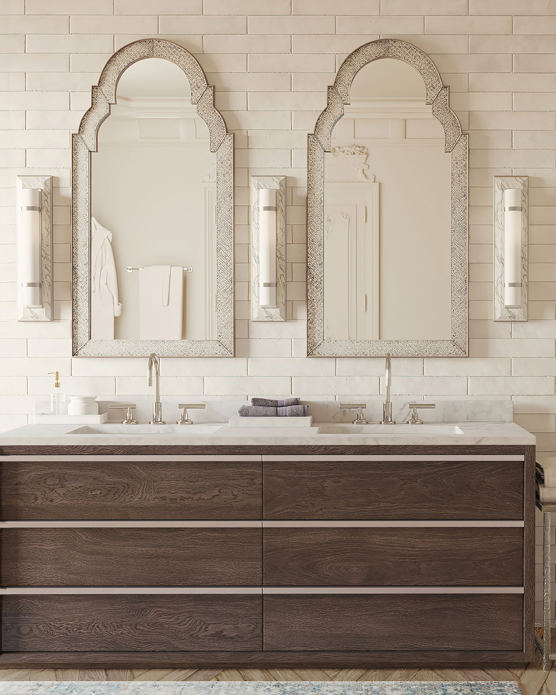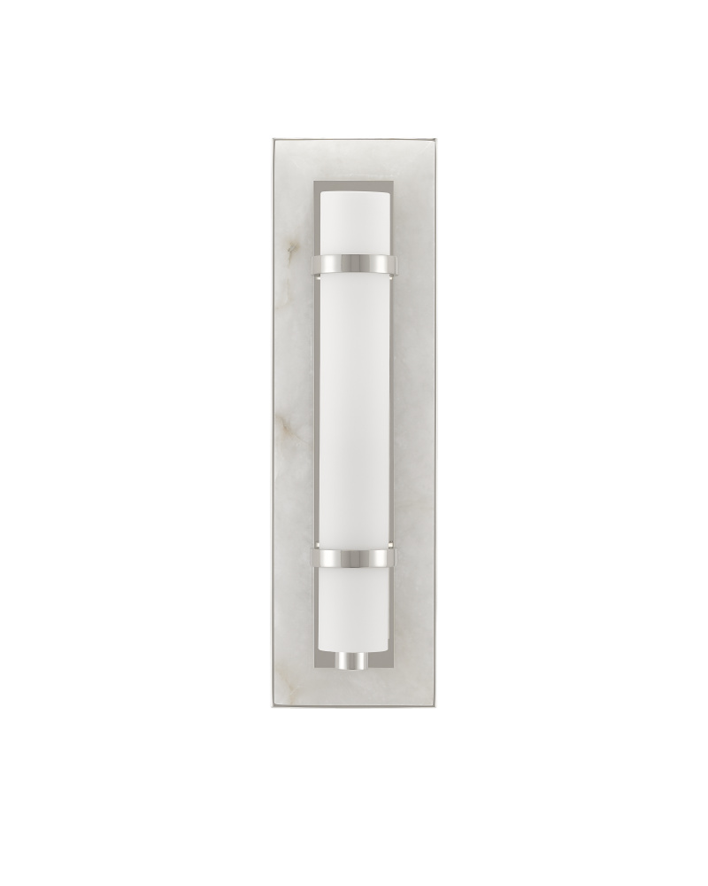 A masterful mix of materials describes the Bruneau Nickel Wall Sconce. From the cloudy alabaster panel affixed to the wall plate, the metal in a gleaming polished nickel finish, and the soft glow of the opaque glass shade, the layering of this design is sophisticated. The strap-like circlets that fasten the shade to the wall plate on this silver wall sconce is a design detail worth noting. Part of the Bagno Collection of wall sconces designed for bathroom spaces.