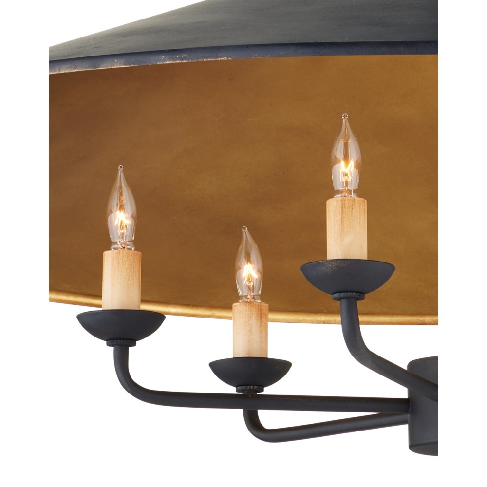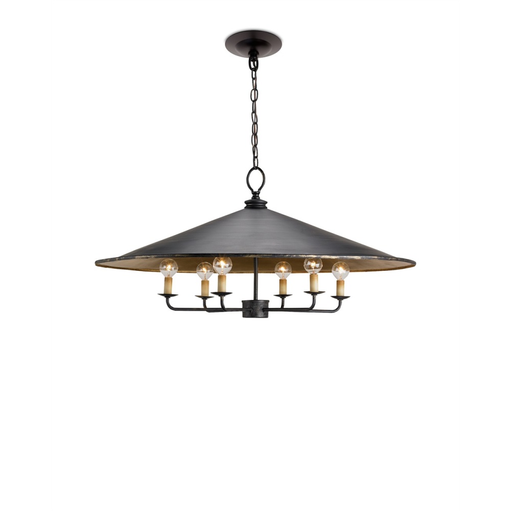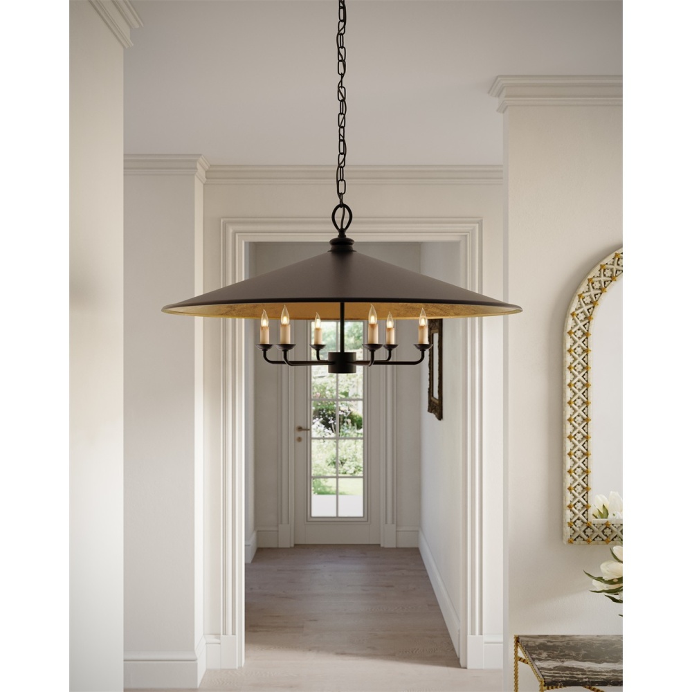A handsome sprawling shade serves as the canopy for the Brussels Pendant, a piece alive with details that bring it a slight oriental profile given the prominence and shape of its shade. A smooth French black finish covers the outside shade, stem and arms of this six-light fixture while a glimmering contemporary gold leaf interior adds contrast to the interior of the shade while also bringing warmth to the glow the pendant emits.