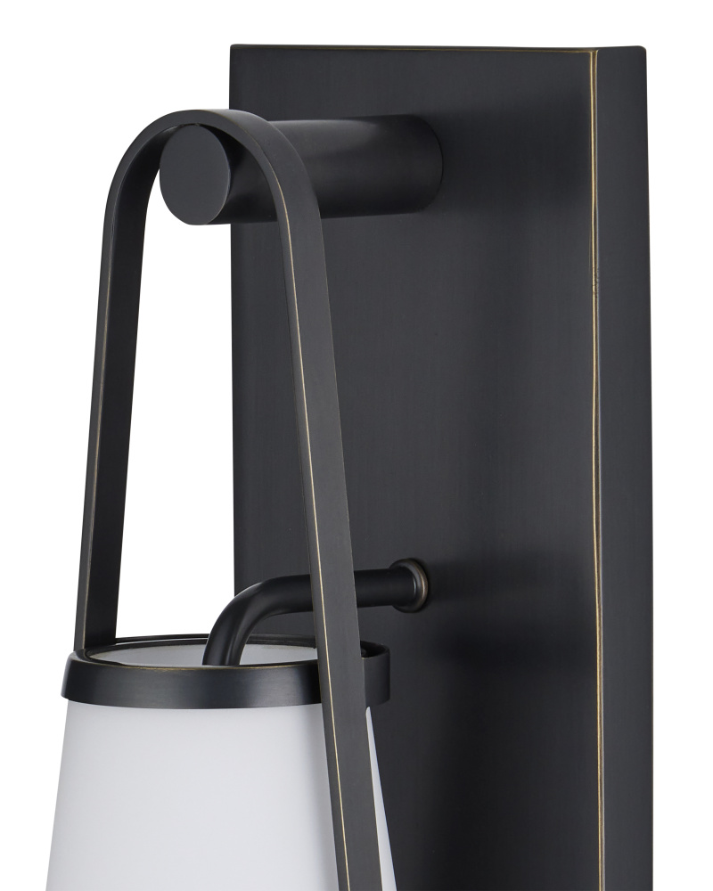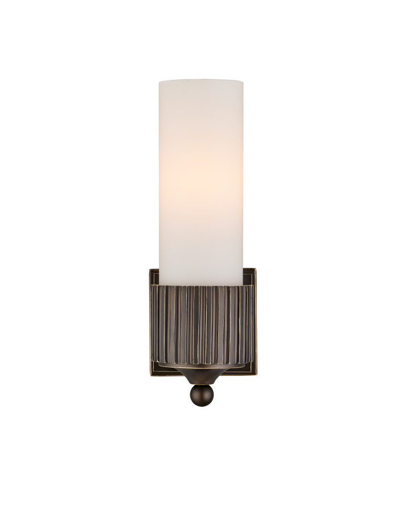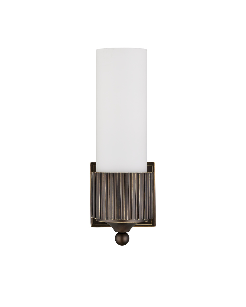 The Bryce Black Bath Wall Sconce is a clean-lined fixture that will be at home in any number of styles. This simple round form is embellished with a motif that hearkens to industrial gears. Its designer Barry Goralnick is adept at exploring these forms to which an oil-rubbed bronze finish brings a handsome touch. The classically inspired finial that ornaments the bottom of the sconce is a sophisticated focal point, and the frosted glass tube provides an even glow.