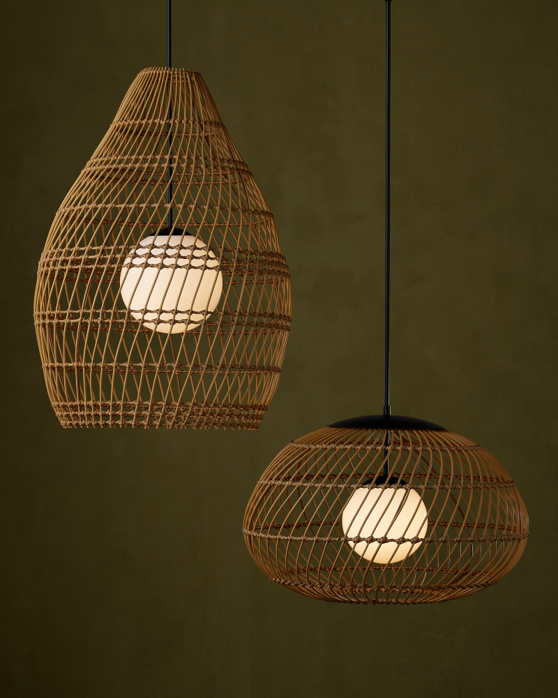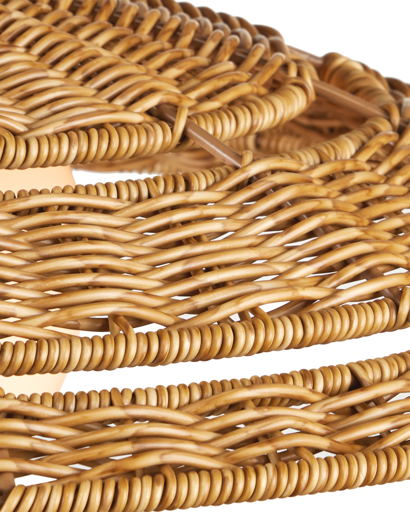 The Carriage Outdoor Pendant has an open-weave shade made of all-weather wicker that can easily withstand the elements, as will the metal hardware in a black powder-coated finish. The sense of movement achieved by the slant of the pattern mimics that of a turbine, which makes the melon-shaped shade seem as if it is spinning. The one-light pendant is wet location-tested, which makes it ideal for lighting patios and porches. Adjustable from 28" to 70" with use of included chain/rod kit/cable. If your space calls for a longer drop, additional chain/rods/cable is available for purchase.