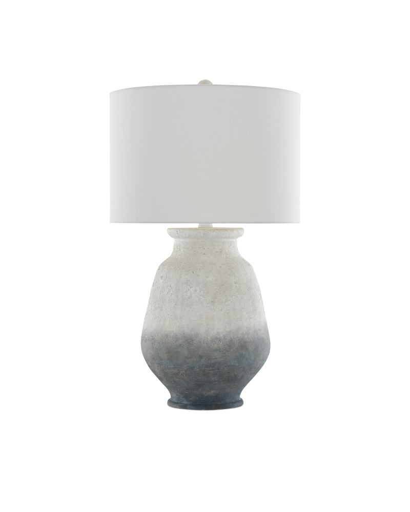 Our Cazalet Table Lamp is made of terracotta with graduating finishes from a smoky blue at the bottom to an ash ivory at the top, which brings the blue and white lamp patina. The wrought iron hardware in an acrylic white finish melds seamlessly with its white surface, as does the acrylic white finial that fastens the off-white linen shade to the lamp.