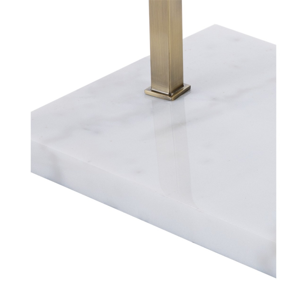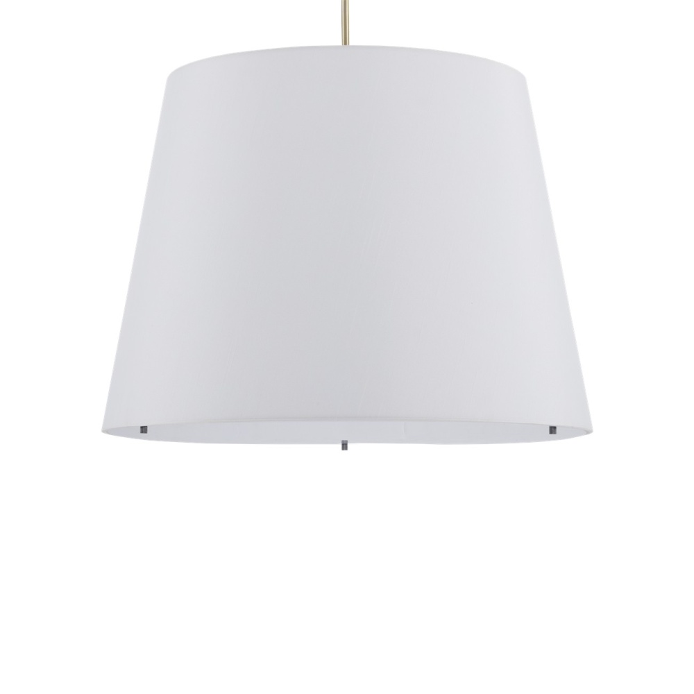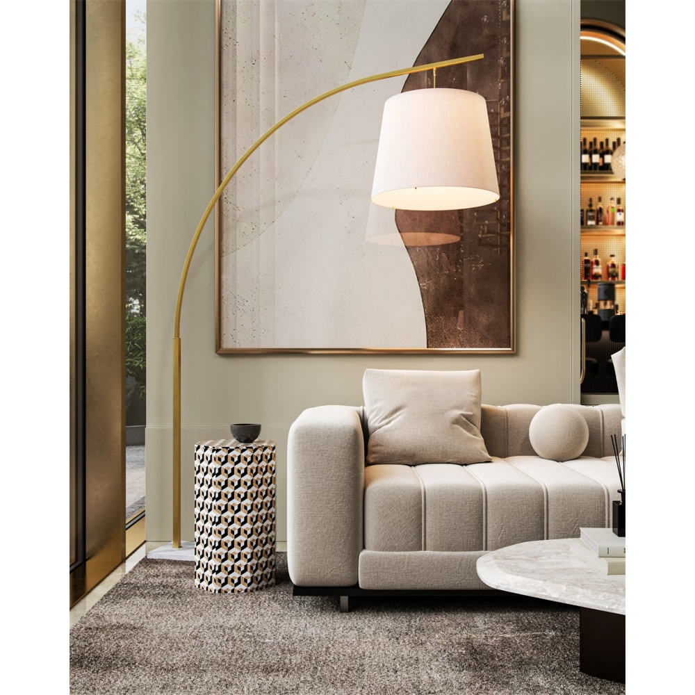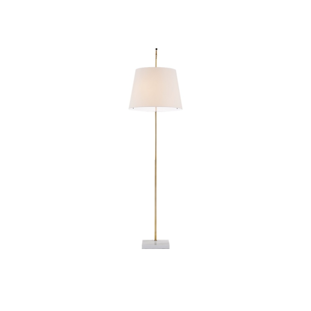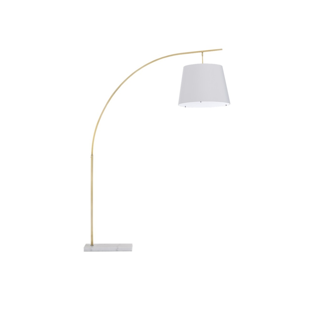 The angular arc of the stem on the Cloister Brass Large Floor Lamp, the way the shade dangles, and the minimal shape of its base are design details that make it an exemplar of contemporary design. The clean way the stem is fastened to the base and the pared-down lines of the white linen shade enhance the gold floor lamp's modernity. The acrylic diffuser fastened by the petite button finial is a clever aspect to this design.