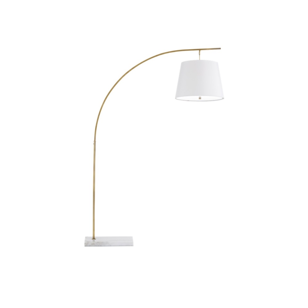 The angular arc of the stem of the Cloister Brass Floor Lamp, the way the shade dangles, and the minimal shape of its base makes it an exemplar of contemporary design. The clean way the stem is fastened to the base and the pared-down lines of the white linen shade enhance the gold floor lamp's modernity. The acrylic diffuser fastened by the petite button finial is a design detail of note.