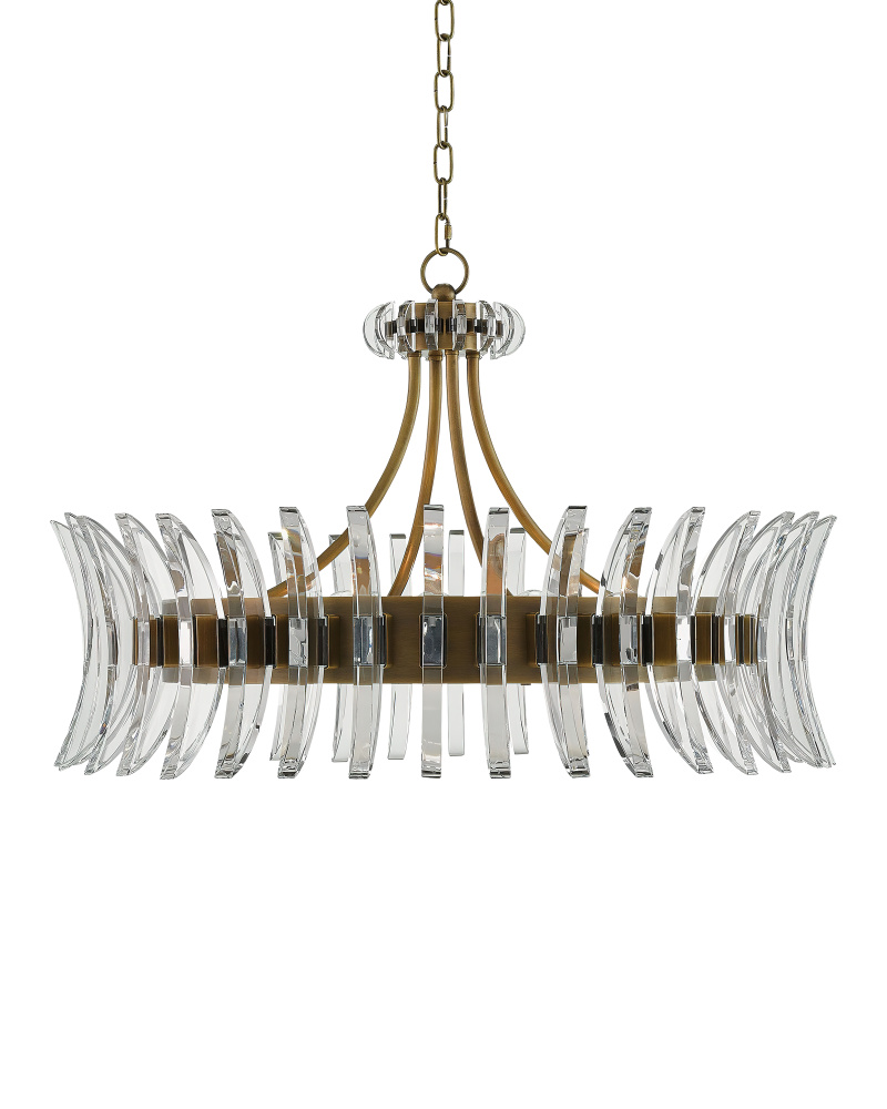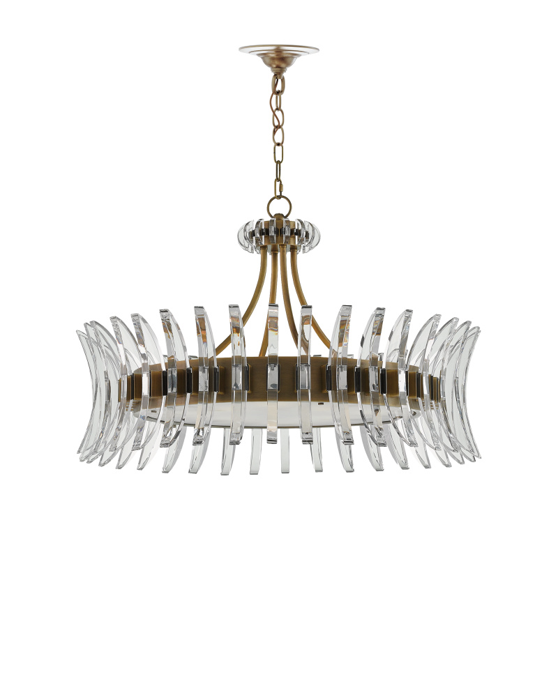 The Coquette Chandelier is a modern iteration of Art Deco artistry that intermingles the brilliance of slices of optic crystal and the depth of metal that has been treated to an antique brass finish. The crystal blades that line the round fixture read like half-moon slivers to bring the chandelier a warm/cool sense of glamour. The eight-light chandelier would bring a sophisticated sense of luxury to any number of rooms in the well-appointed home.