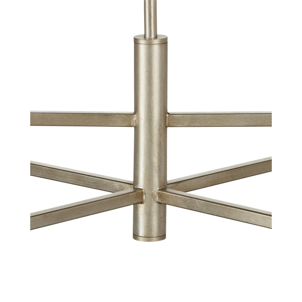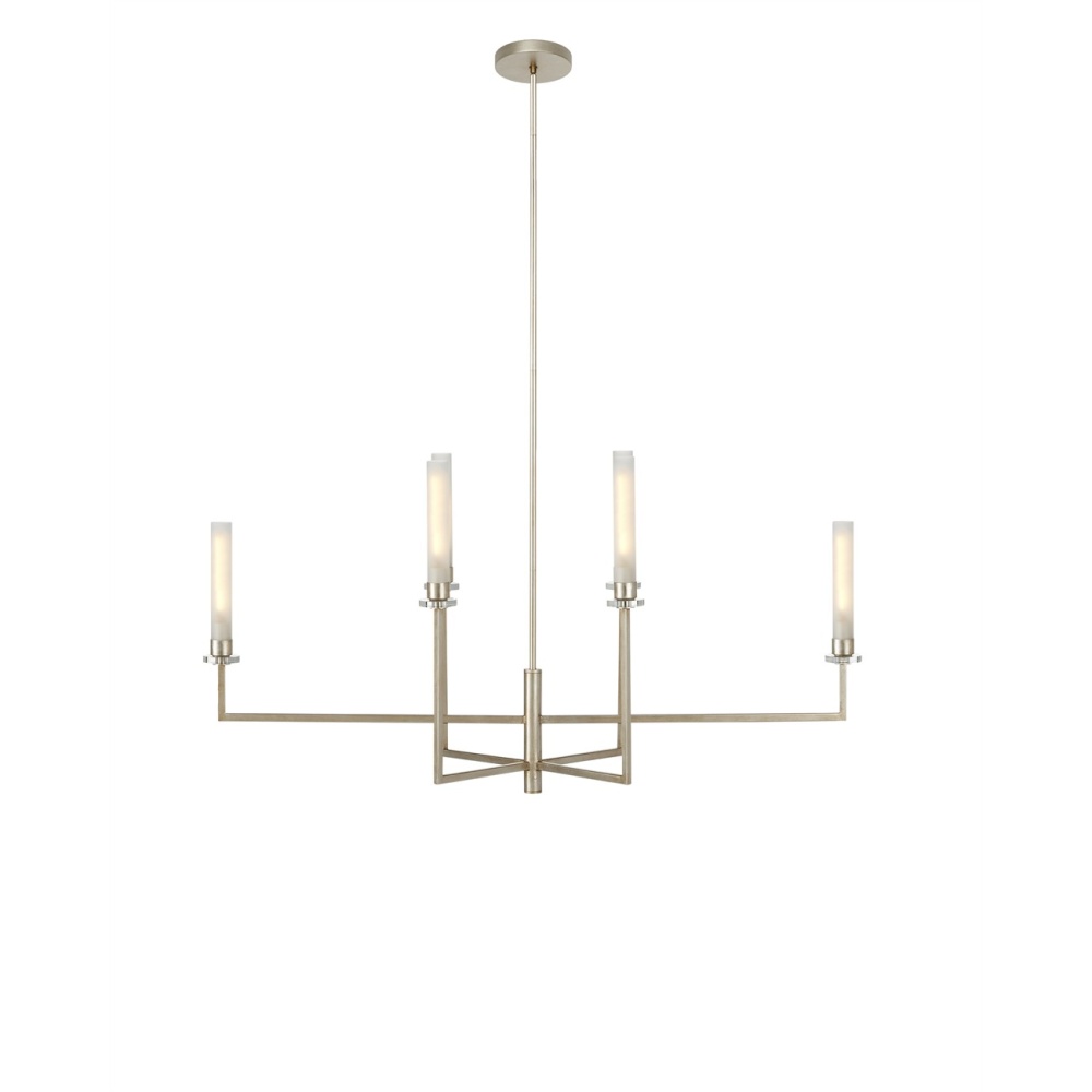 Made of metal in a champagne finish, the squared arms of the Courante Silver Chandelier balance optic crystal bobeches and frosted glass candle sleeves that enclose LED bulbs. Designed in an oblong shape, this chic chandelier is perfect for illuminating rectangular tables or kitchen islands. The height of the arms, the pared-down profile, and the gleaming combination of materials and finishes transform this traditional style into a thoroughly modern design. Adjustable from 27.5" to 69.5" with use of included chain/rod kit/cable. If your space calls for a longer drop, additional chain/rods/cable is available for purchase.