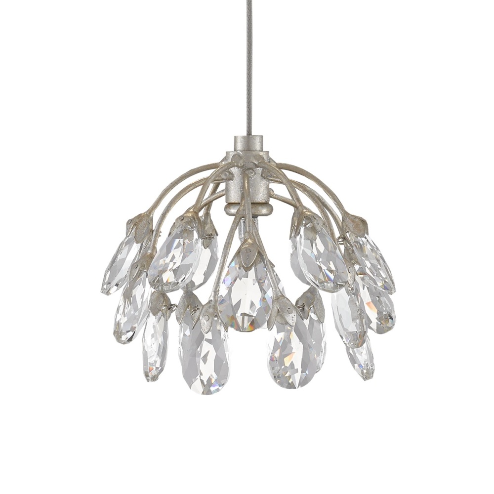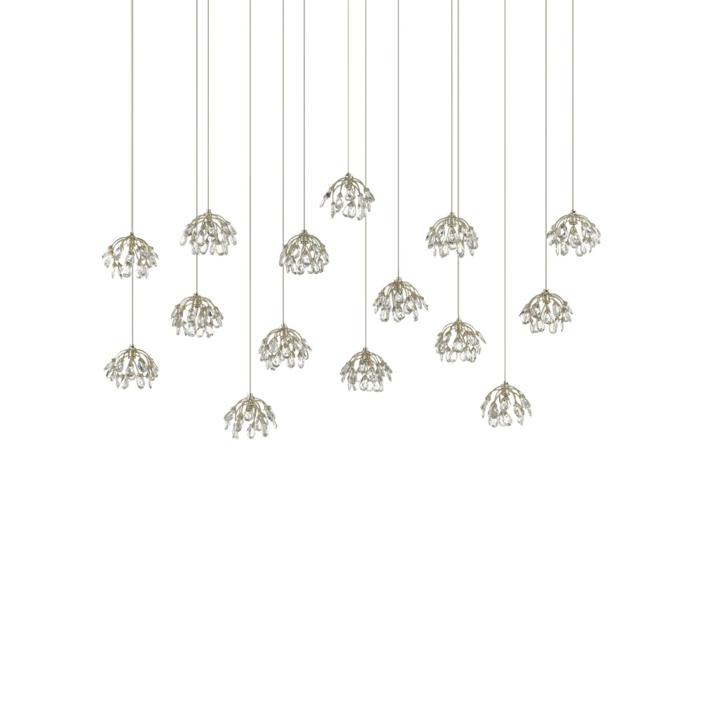 The Crystal Bud Rectangular 15-Light Multi-Drop Pendant dangles flowers made of delicate faceted crystals from its canopy to make the shades effervescent and graceful. The canopy of this piece is luminous in a painted silver finish. This fixture is among Currey & Company's multi-drop pendant collection, which includes multiple configurations.