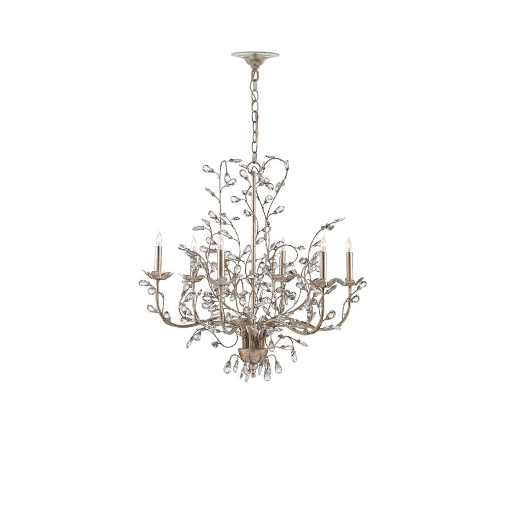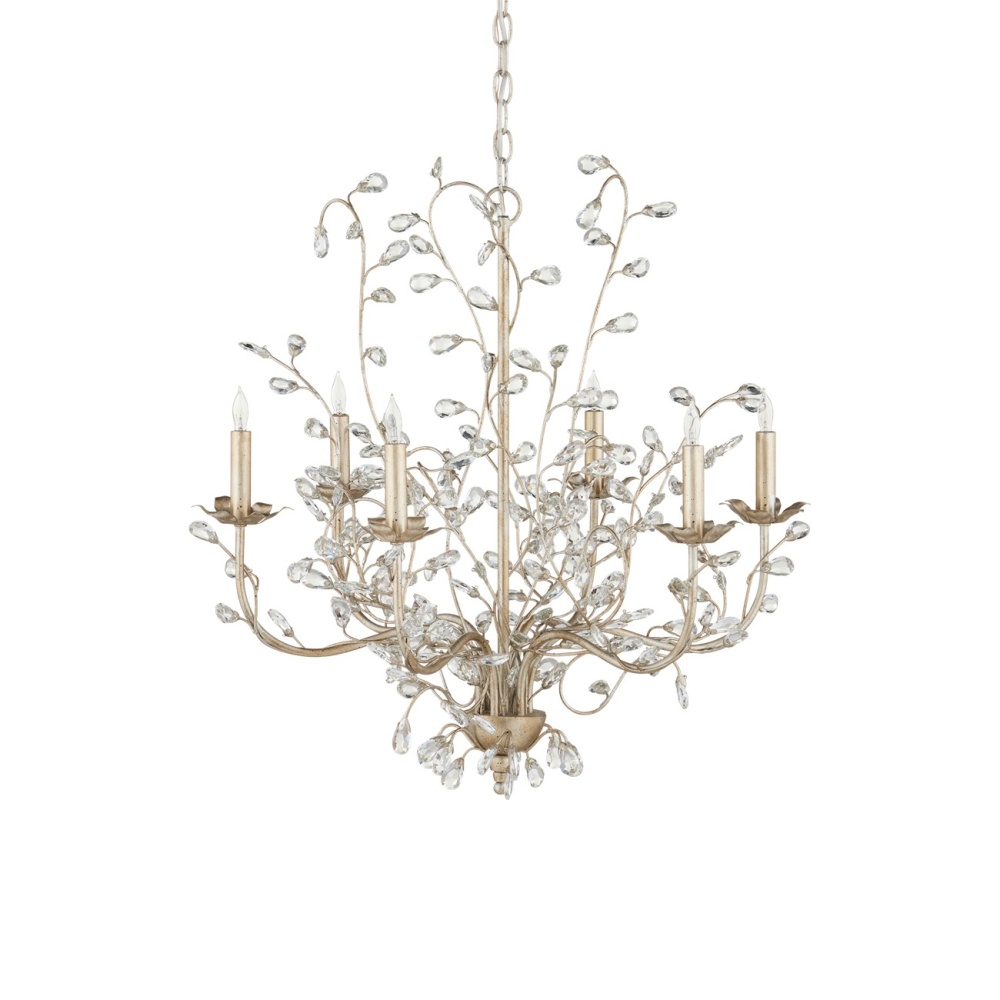 The pleasing attributes of nature merge with the conventions of finely crafted traditional design in the silver version of our romantic Crystal Bud Chandelier in a medium size. Delicate faceted crystals unfurl from the silver Granello-finished vines that make up the flowing profile of this idyllic piece. The six-light chandelier is one of the fixtures in the Crystal Bud family of lights.