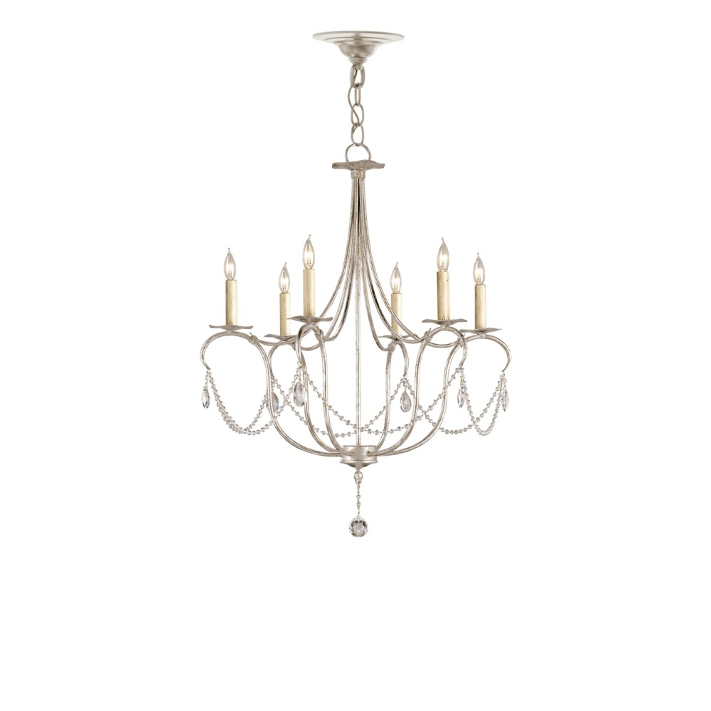 The small version of our Crystal Lights Chandelier flaunts its jewelry fittingly, as its beads are far from mere ornamentation: they are essential to the heart of this design. The crystals swag between elegant wrought-iron spokes that curl daintily at the ends. Wires bind the curling supports to those cascading from the canopy for added cohesion in the design details, all treated to a silver leaf finish. We see the fixture with its six candelabra bulbs as the perfect bauble for the bewitching boudoir.