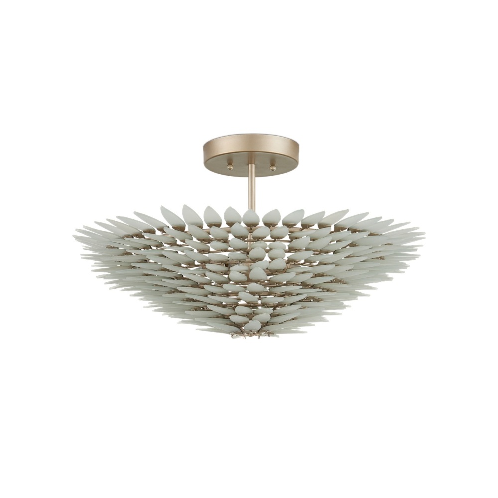 The Dahlia Semi-Flush Mount has a tiered design with spiky, leaf-like elements hand-cut from glass bottles. Each glass piece is secured to the wrought iron frame with flower-shaped brads that serve as a refined detail. Once shaped and polished, the petals are affixed to the frame in a contemporary silver finish to blossom on the ceiling when illuminated.
