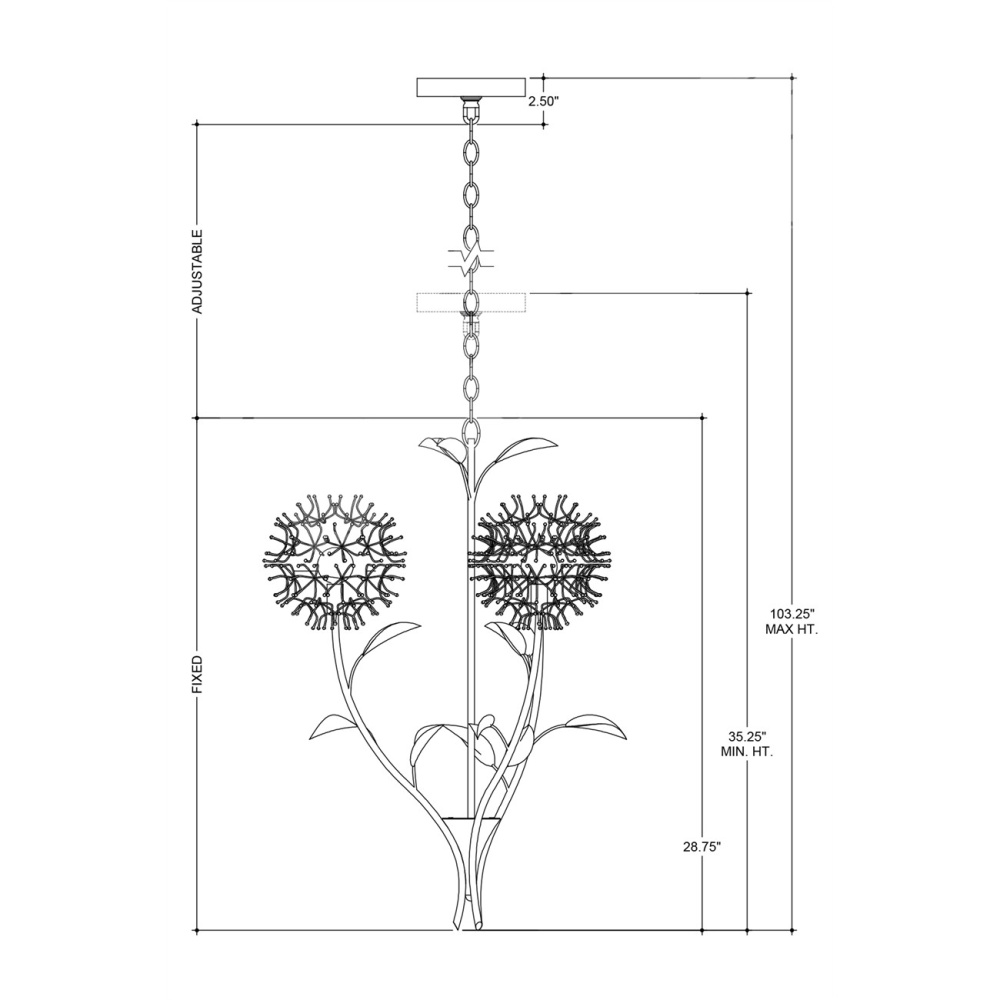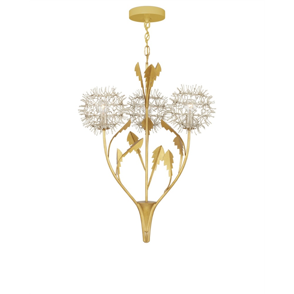The Dandelion Silver & Gold Pendant is a masterful composition that celebrates its namesake flower. The puff-balls that surround the bulbs are made of nails that are bent and welded together, a process that is extremely labor intensive. Made of wrought iron, the pendant's bottom cone, stems, and leaves are in a contemporary gold leaf finish, while the floral elements are in a mix of contemporary silver leaf and contemporary silver finishes. This special piece expressively celebrates nature. Adjustable from 35.25" to 103.25" with use of included chain/rod kit/cable. If your space calls for a longer drop, additional chain/rods/cable is available for purchase.
