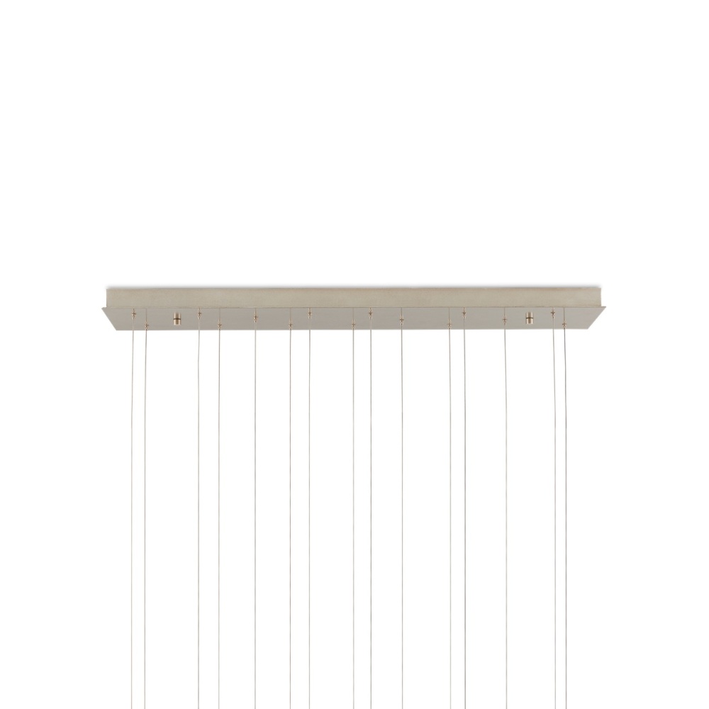 When a soft glow is desired, milk glass is one of the best materials to diffuse illumination. Our Daze Rectangular 15-Light Multi-Drop Pendant is made of articulated panels of white milk glass that are joined together by ribs of metal in an antique brass finish. This brass and white multi-drop pendant will turn luminous when it is switched on. The canopy of this piece is luminous in a painted silver finish. This fixture is among Currey & Company's multi-drop pendant collection, which includes multiple configurations.