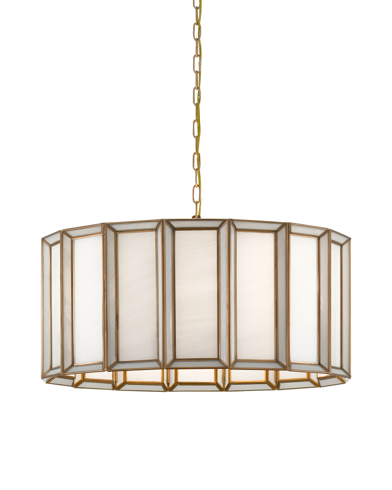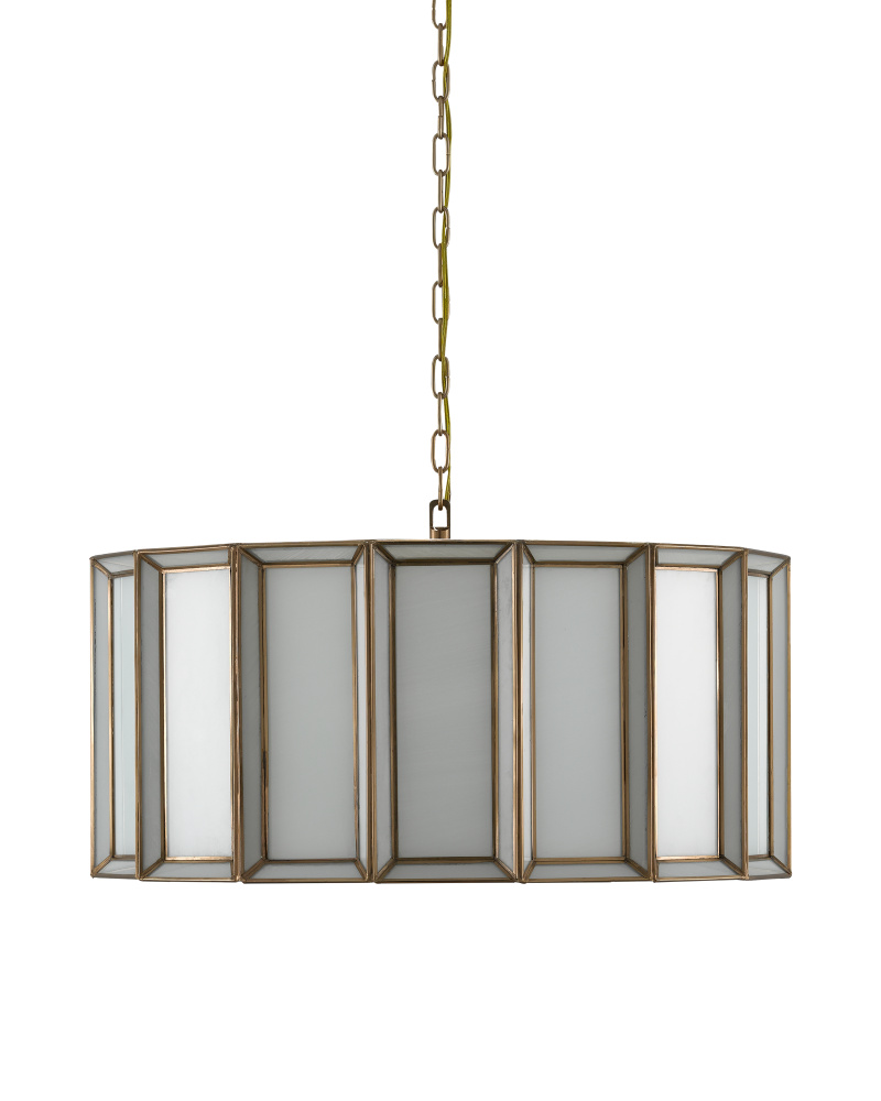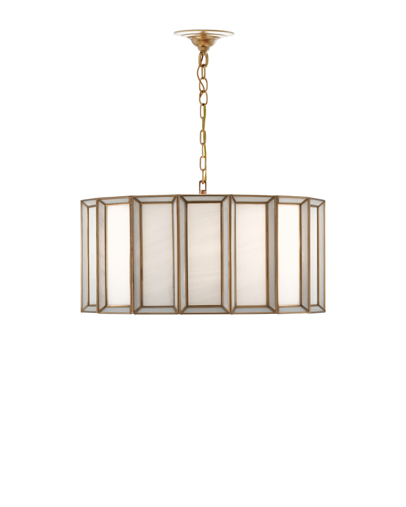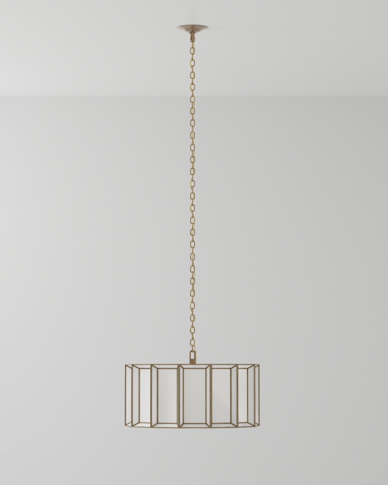 When a soft glow is desired, milk glass is one of the best materials to diffuse illumination. Our Daze Large Pendant is made of articulated panels of white milk glass that are joined together by ribs of metal in an antique brass finish. This white pendant will turn luminous when it is switched on. Adjustable from 19.5" to 87.5" with use of included chain/rod kit/cable. If your space calls for a longer drop, additional chain/rods/cable is available for purchase.