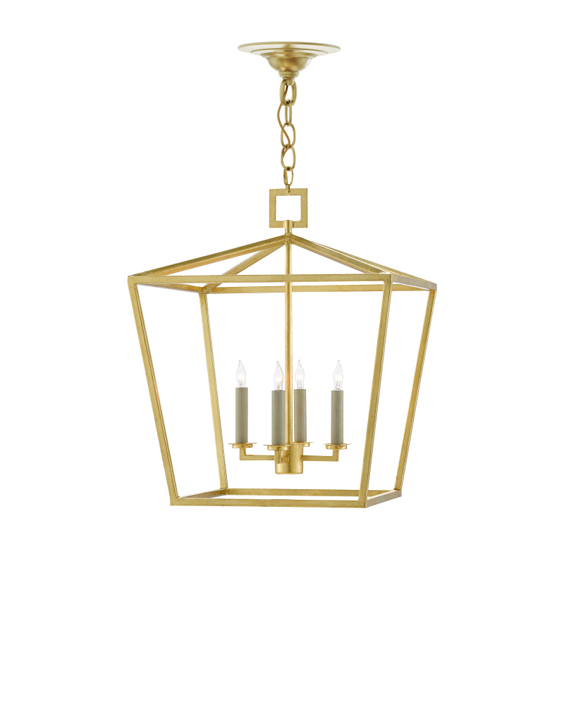 The Denison Gold Medium Lantern strikes a cagey silhouette, its hammered wrought-iron frame encasing the lantern’s glowing bulbs subtly distressed with a contemporary gold leaf finish. This classic shape has stood the test of time to illuminate nearly every room in the home in its various manifestations. We offer a number of sizes and finishes in the Denison Lanterns.