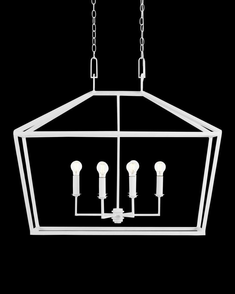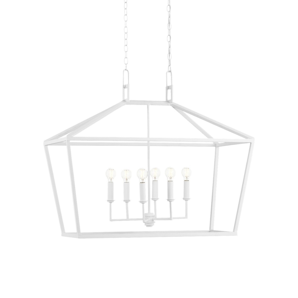 The Denison White Rectangular Chandelier is a hammered wrought-iron fixture in a gesso white finish. This classic lantern shape has stood the test of time to make it one of our most popular offerings. A refined aspect of the design is the square that fastens the lantern to the chain. The pared-down profile and pale finish on this version makes it perfect for coastal aesthetics. Adjustable from 42" to 110" with use of included chain/rod kit/cable. If your space calls for a longer drop, additional chain/rods/cable is available for purchase.