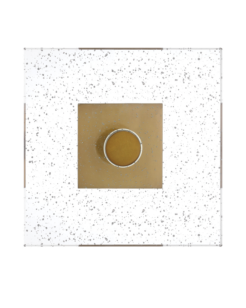 The Desiree Drinks Table is a study in geometric elegance that blends clean lines with luxurious materials. The tall block base and the top of the rod-like stem that holds the top are crafted from metal in an antique brass finish. Between these elements, a tube of optic crystal introduces a brilliant element that mirrors the light-catching quality of the square top, which is made of textural seeded glass.