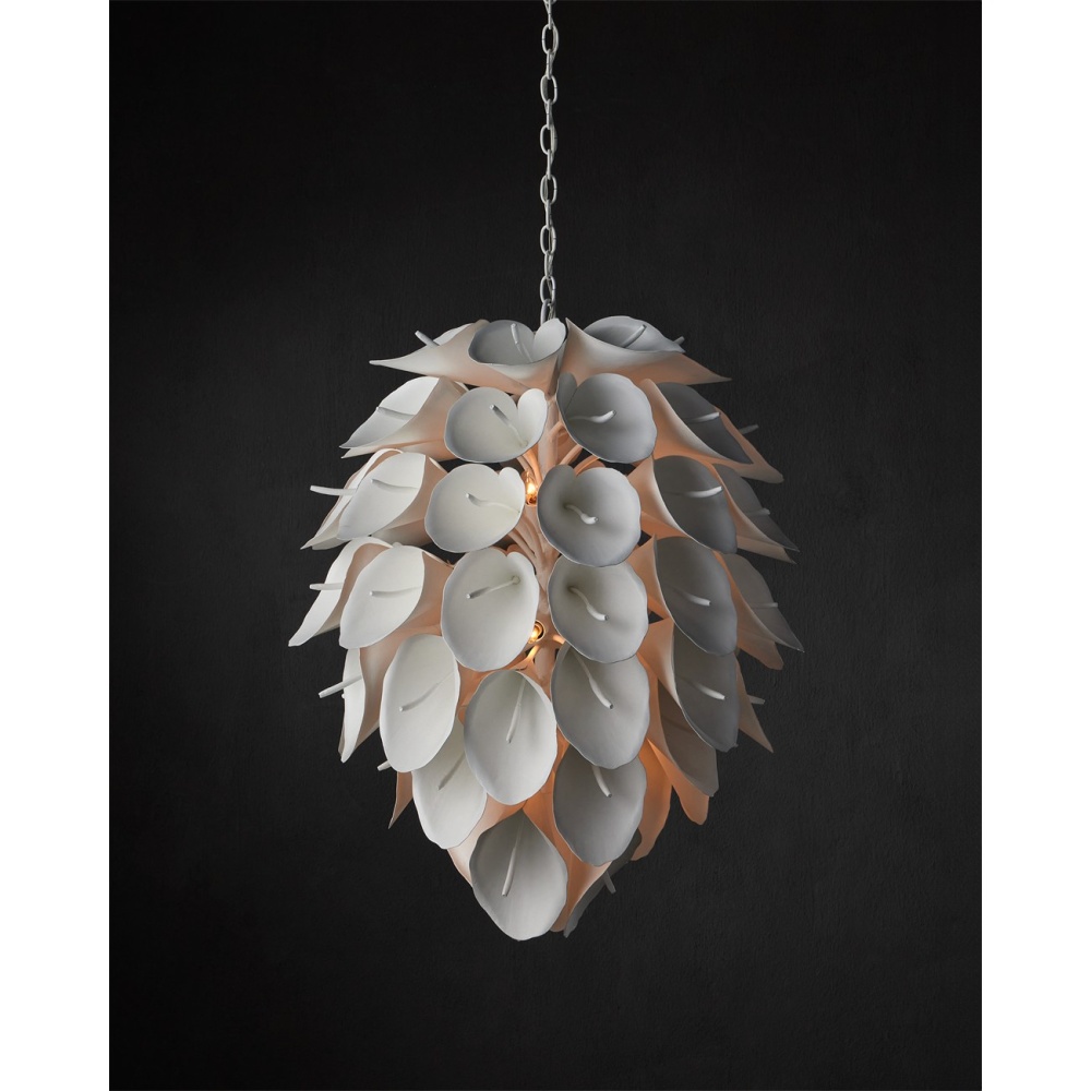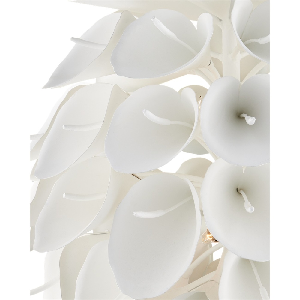 The Diego Chandelier is a magical teardrop-shaped fixture made from wrought iron in a white gesso finish. This graceful chandelier was designed by Marjorie Skouras to continue her celebration of the Yucatan Peninsula that she calls home. The Calla Lily, which flourishes in her surroundings, inspired this white chandelier, which joins a number of her offerings that celebrate the flora and fauna around her studio. Adjustable from 40.25" to 108.25" with use of included chain/rod kit/cable. If your space calls for a longer drop, additional chain/rods/cable is available for purchase.