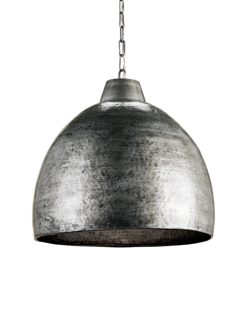 The Earthshine Steel Large Pendant has a hammered dome shape for a cool industrial look. Made of iron in a blackened steel finish, this sturdy silver pendant has a luminous glow on the interior. Adjustable from 28.5" to 95.5" with use of included chain/rod kit/cable. If your space calls for a longer drop, additional chain/rods/cable is available for purchase.