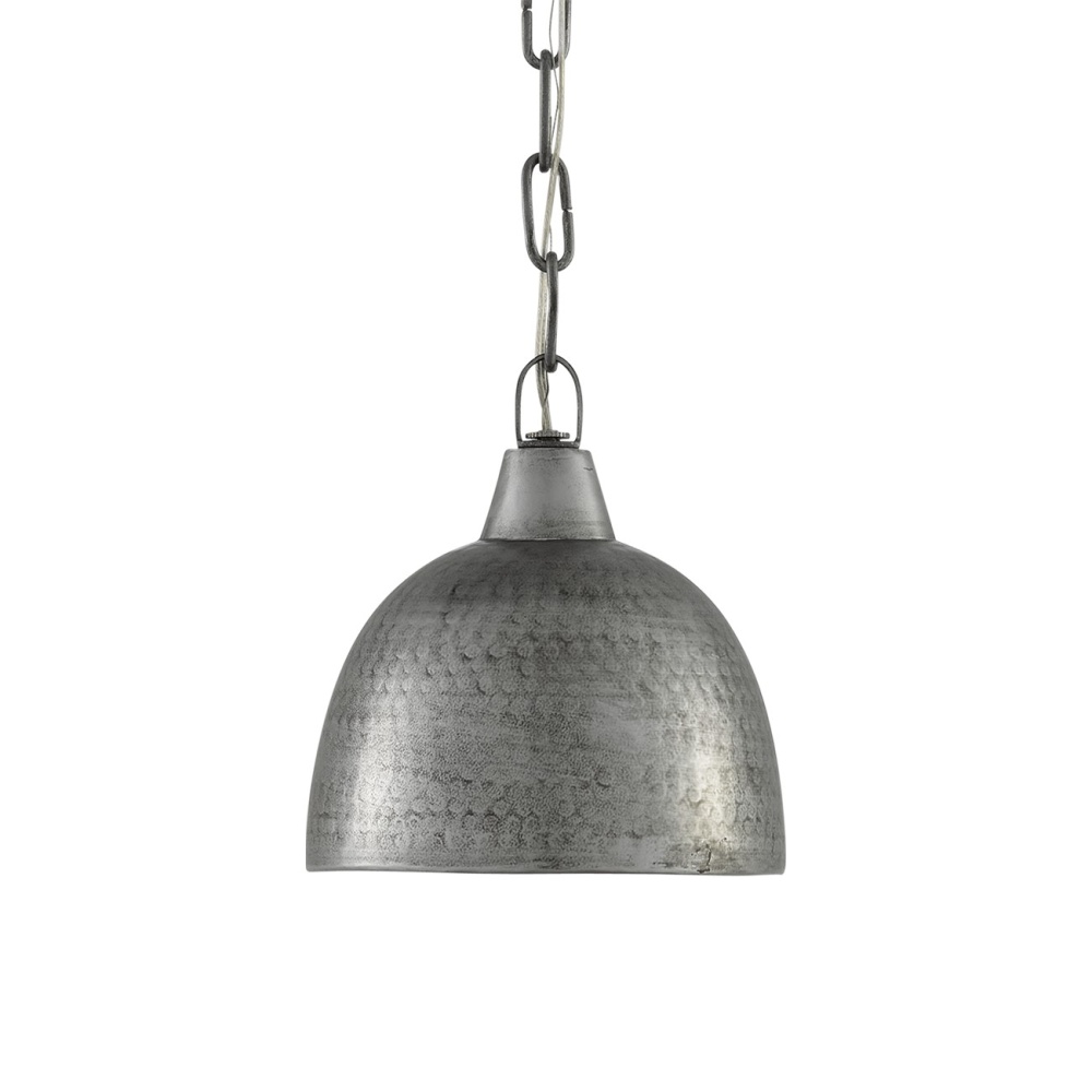 The Earthshine Steel Small Pendant has a hammered dome shape for a cool industrial look. Made of iron in a blackened steel finish, this sturdy silver pendant has a luminous glow on the interior. Adjustable from 14" to 84" with use of included chain/rod kit/cable. If your space calls for a longer drop, additional chain/rods/cable is available for purchase.