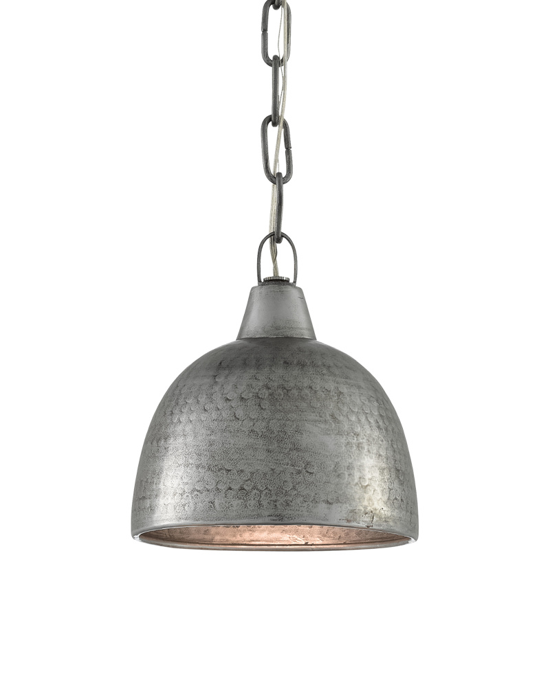 A unique hammered blackened steel finish gives this classic dome style fixture a cool industrial look. But it’s the luminous glow on the interior of the Earthshine Steel Small Pendant that brings the warmth of sunlight to a space. Made of iron that has been treated to a blackened steel finish, this sturdy pendant will turn on its earthy good looks to illuminate an urban oasis or an edgy-cum-modern city loft. We offer this fixture in a small brass version and a larger gold version.